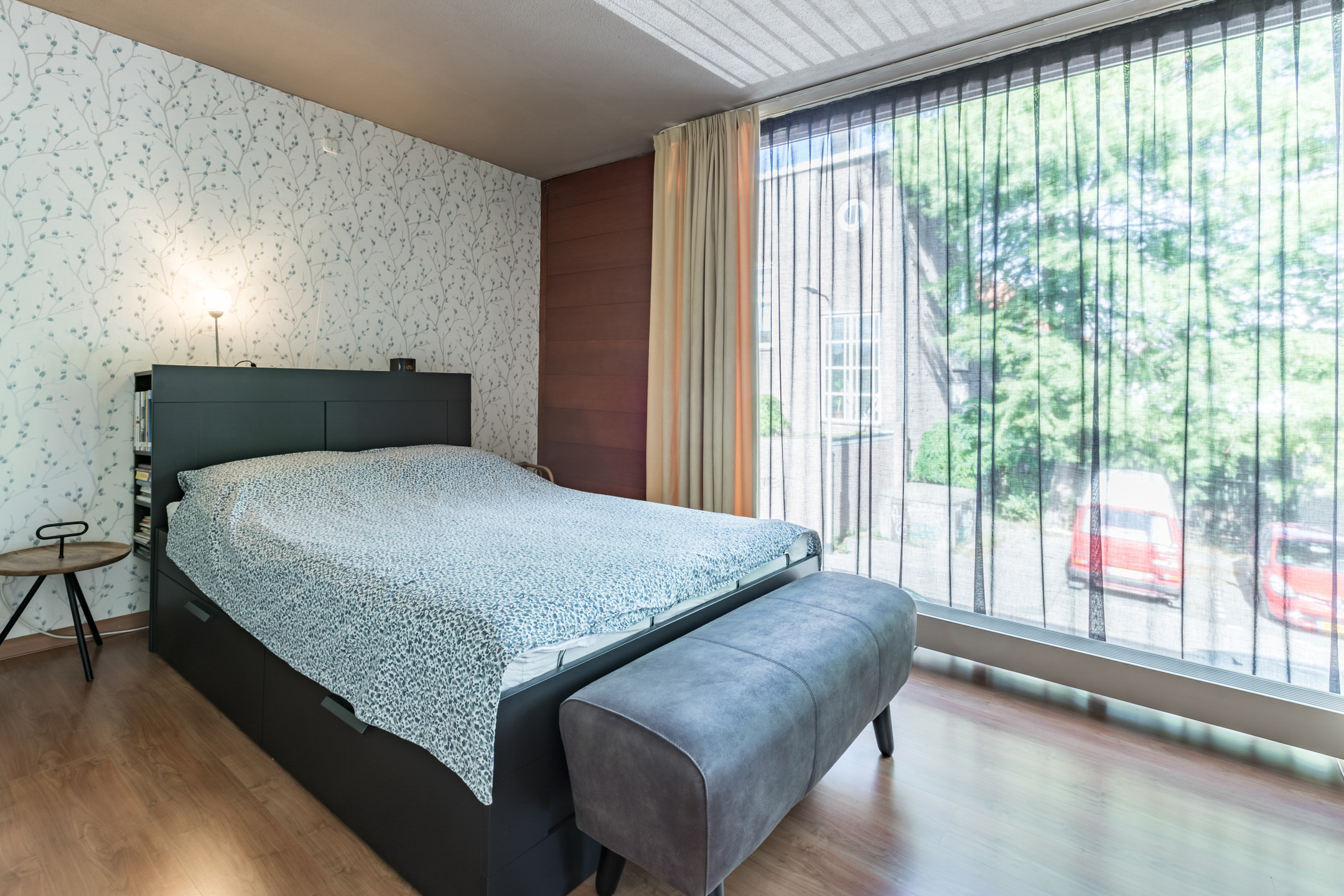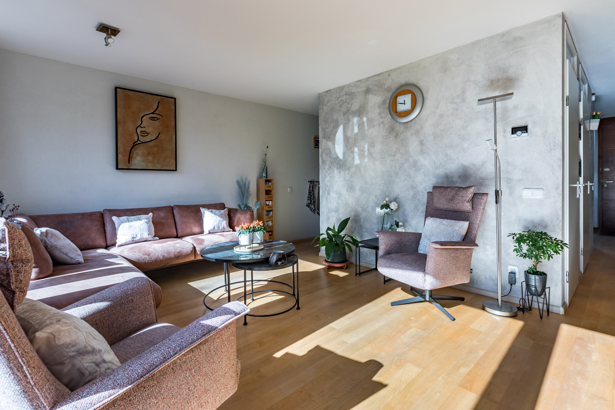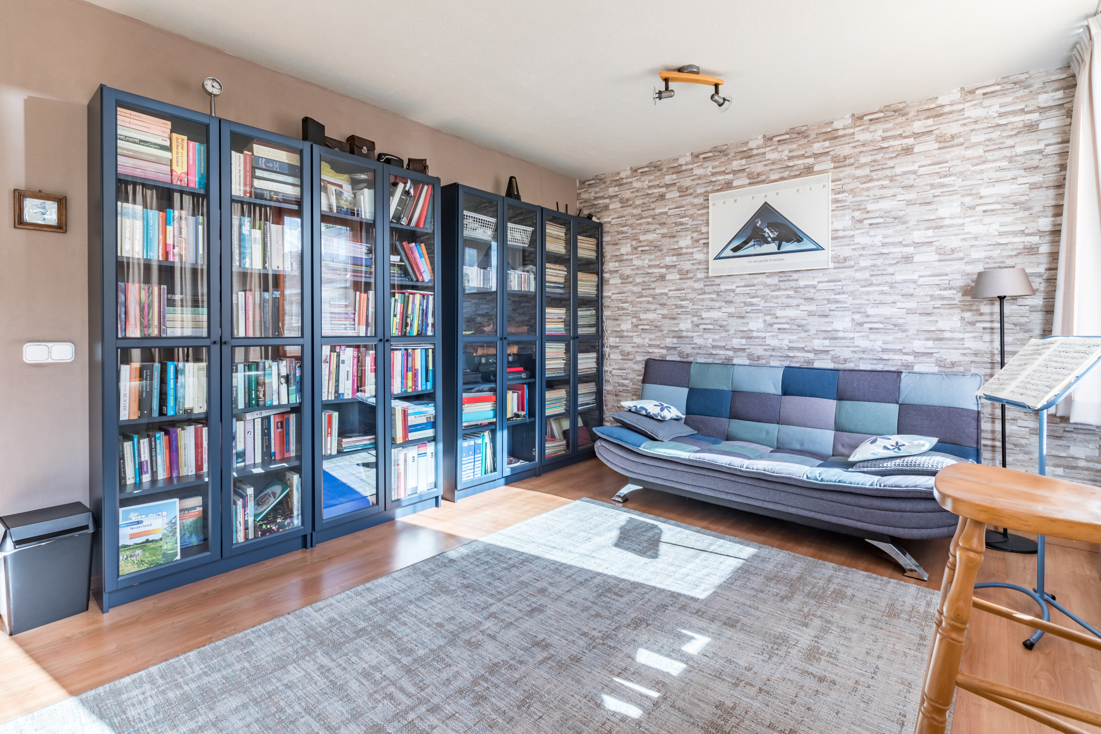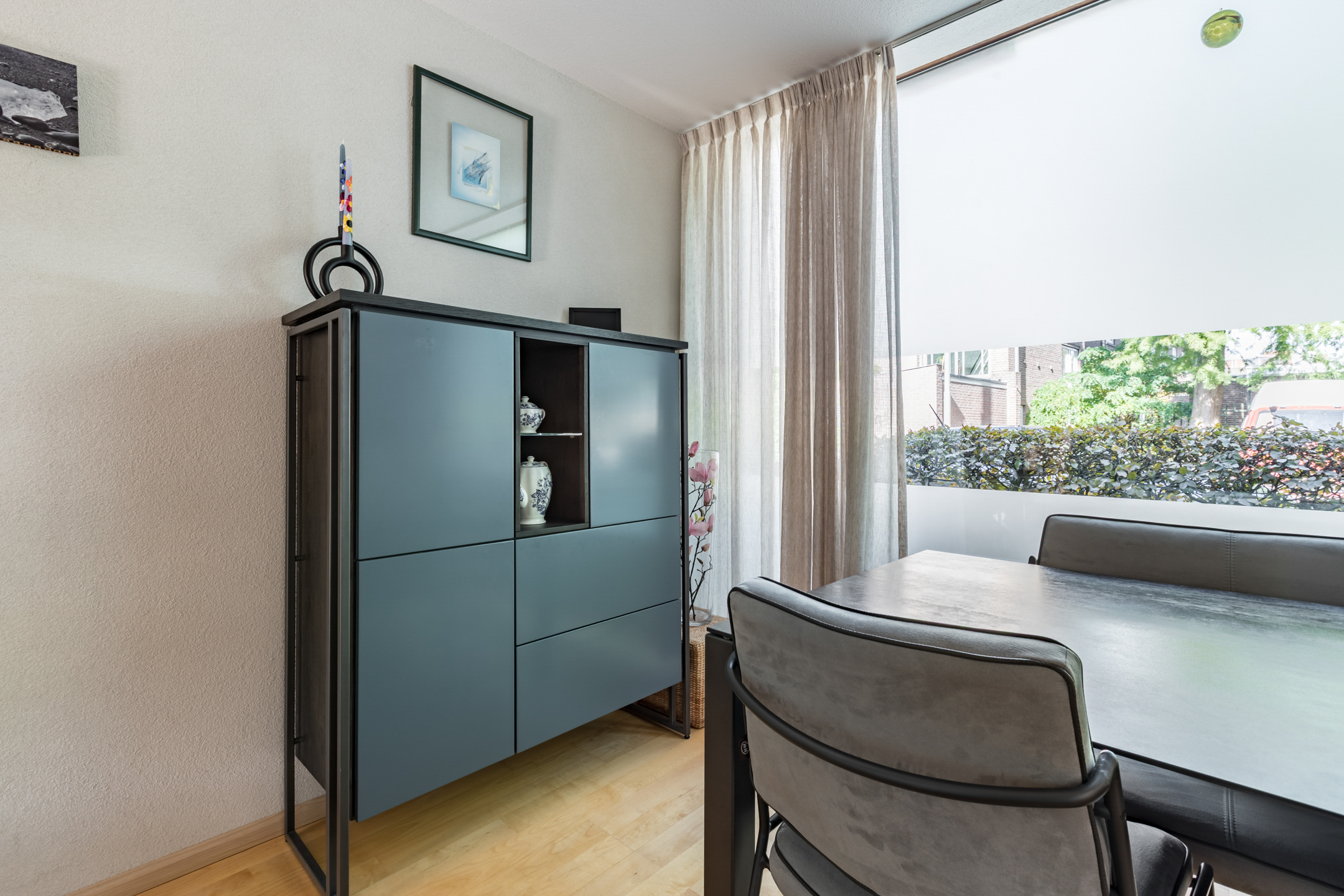 De woonkamer is voorzien van een parketvloer, spachtelputz en betonstuc wandafwerking. Een schuifpui geeft toegang tot de achtertuin. De grote raampartijen zorgen voor veel lichtinval met aan de voorzijde een fraai zicht op het straatbeeld en aan de achterzijde op de tuin.