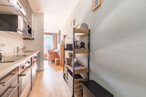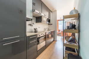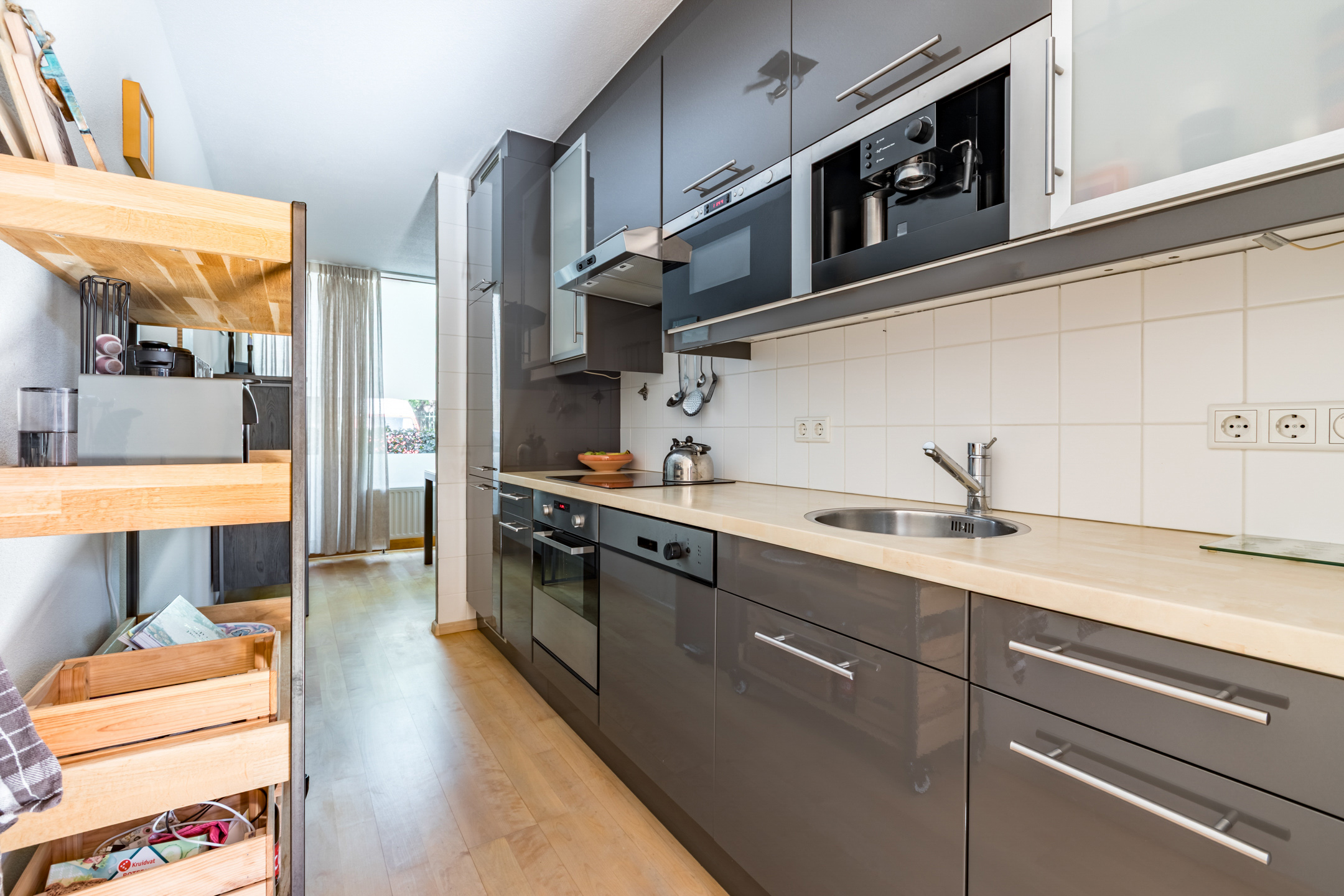 Semi open woonkeuken met een moderne keukeninrichting (2011) in rechte opstelling. De keukeninrichting is voorzien van een inductie kookplaat, afzuigkap, koel-/ vriescombinatie, oven, magnetron en een vaatwasser.