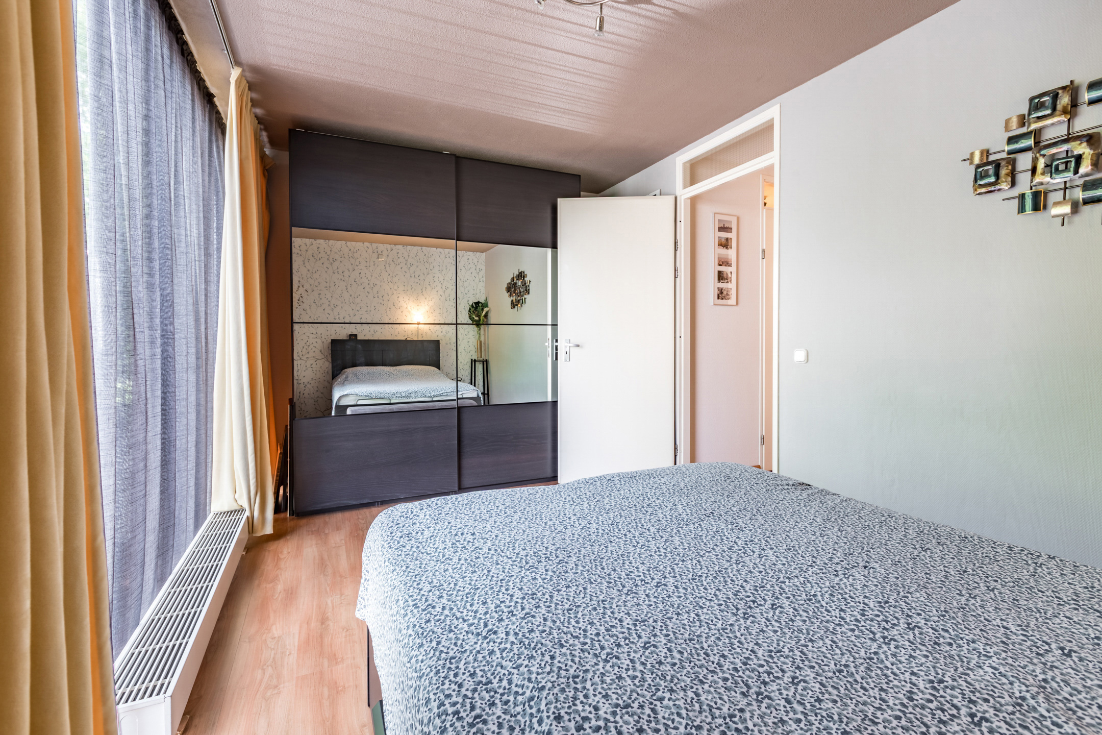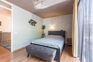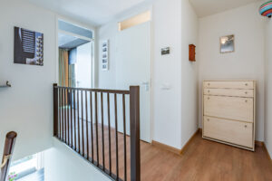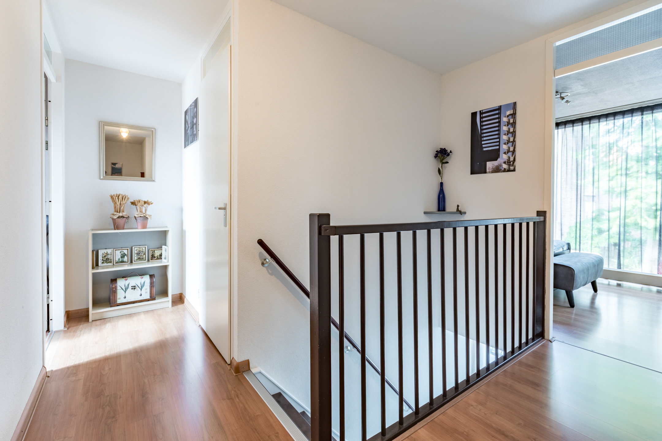 Overloop met laminaatvloer en spachtelputz wandafwerking, die toegang geeft tot twee grote slaapkamers, de badkamer en een aparte wasruimte/ berging.