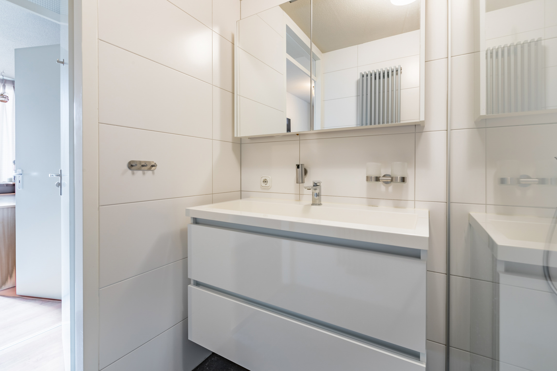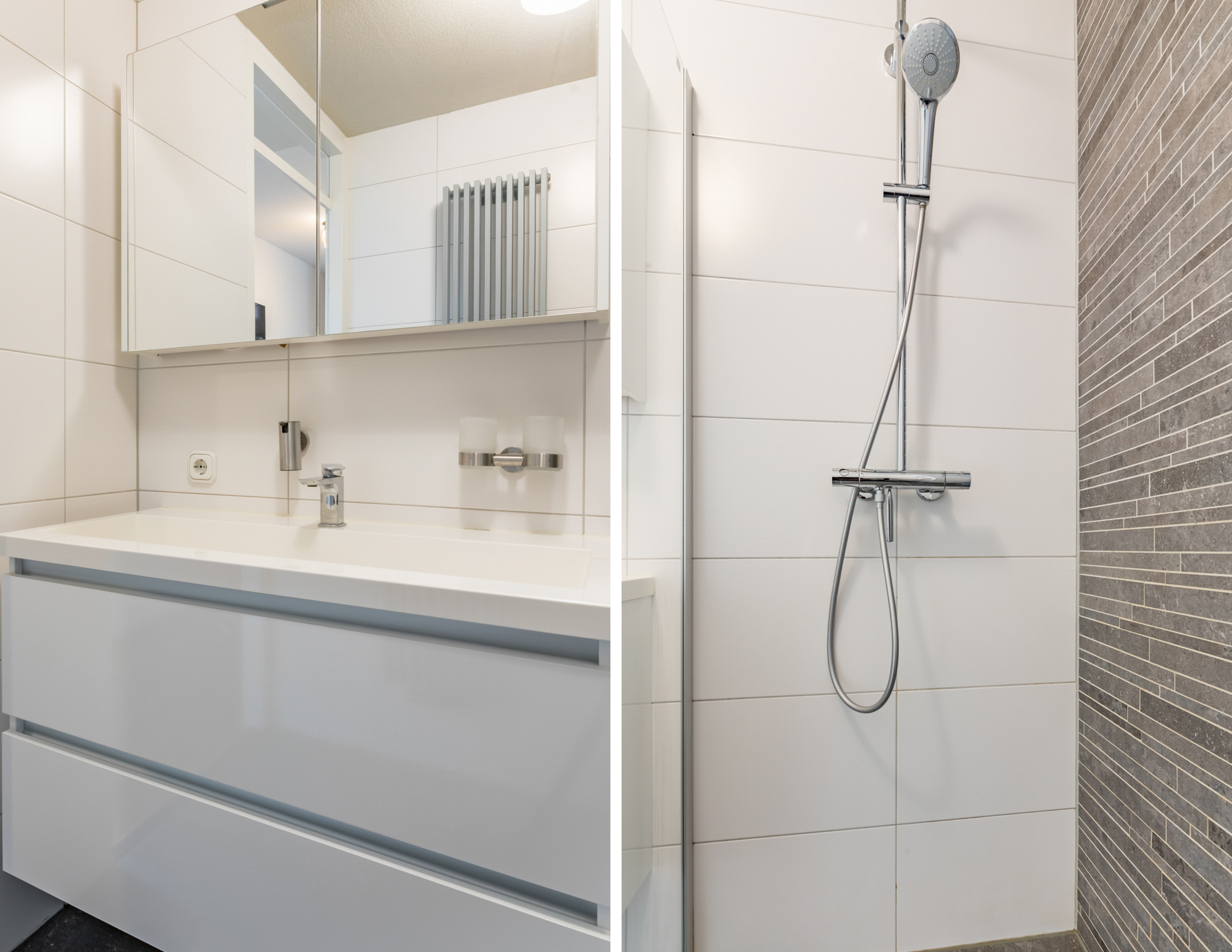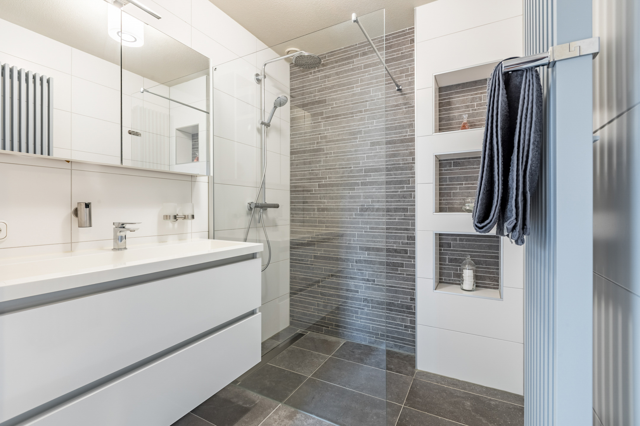 Luxe en moderne badkamer (2017) voorzien van een extra brede vaste wastafel met meubel, inloopdouche met regendouche en een thermostaat kraan, speelse nisjes en een design radiator.