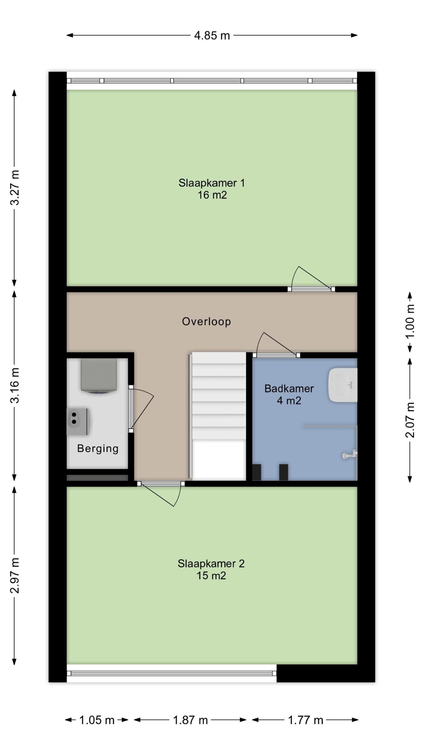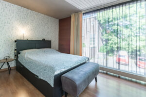 Voorslaapkamer circa 15m² met Frans balkon en een achterslaapkamer circa 16m². De mogelijkheid bestaat om de achterslaapkamer te splitsen in twee slaapkamers. Om u een idee te geven van deze mogelijkheid hebben wij hiervoor een “optie” tekening toegevoegd.