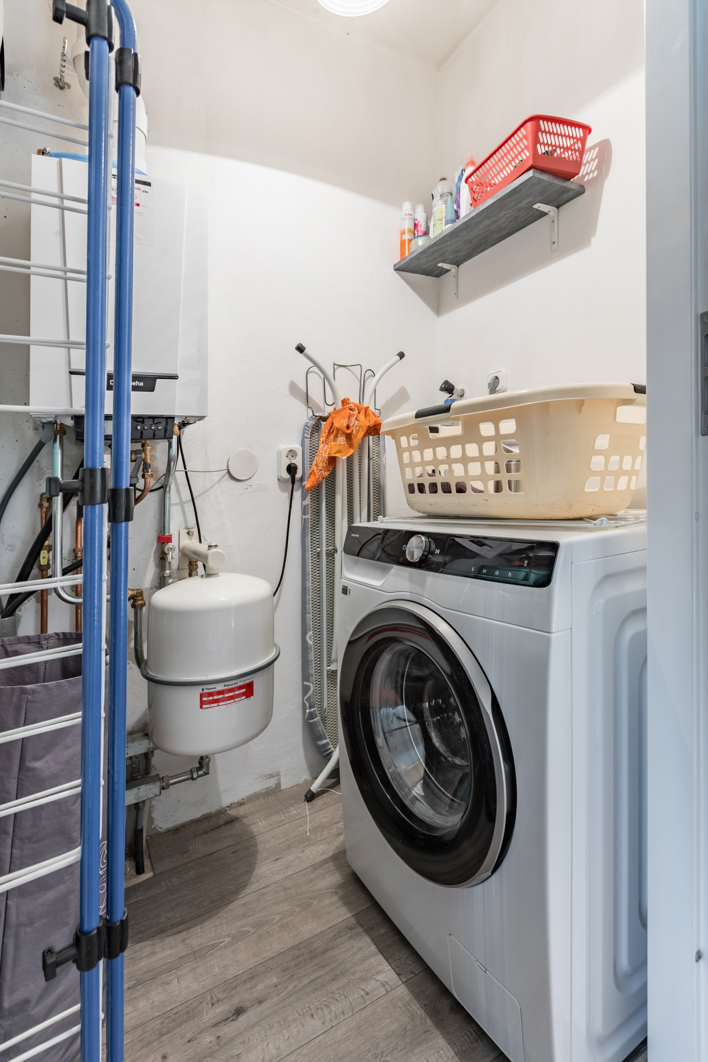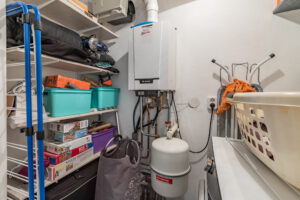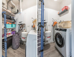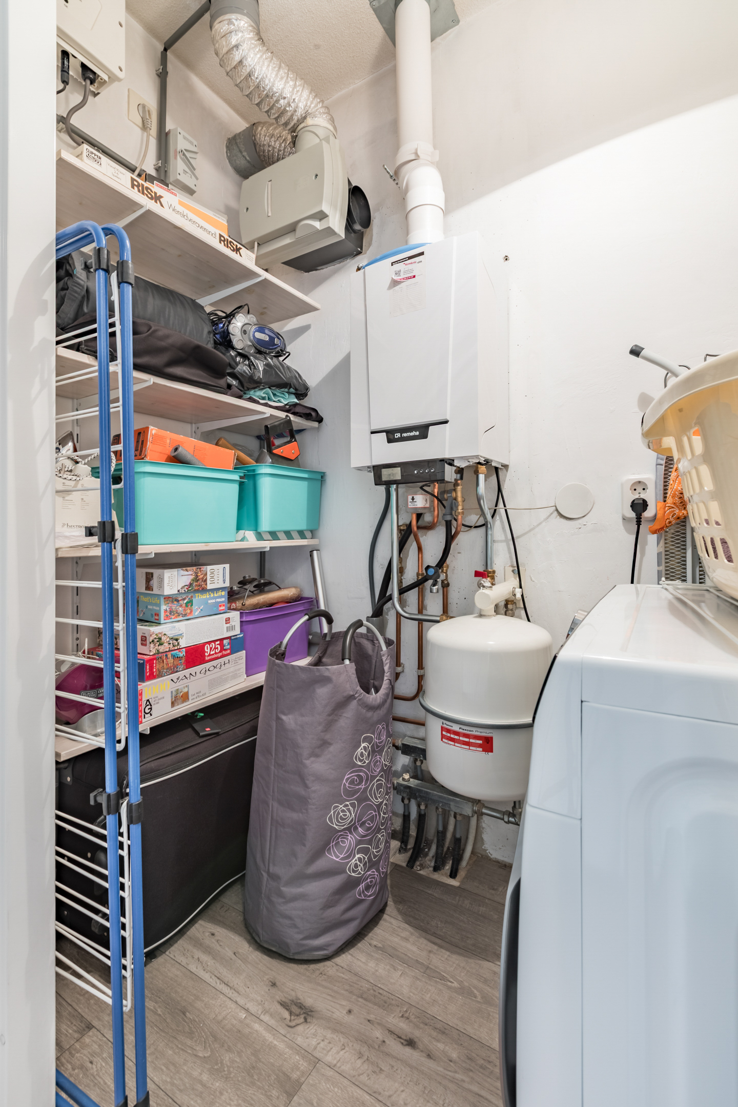 Wasruimte/ berging voorzien van de aansluitingen voor de wasapparatuur, c.v. combi ketel (Remeha Tzerra 2020), unit voor de mechanische ventilatie en de omvormer voor de zonnepanelen.