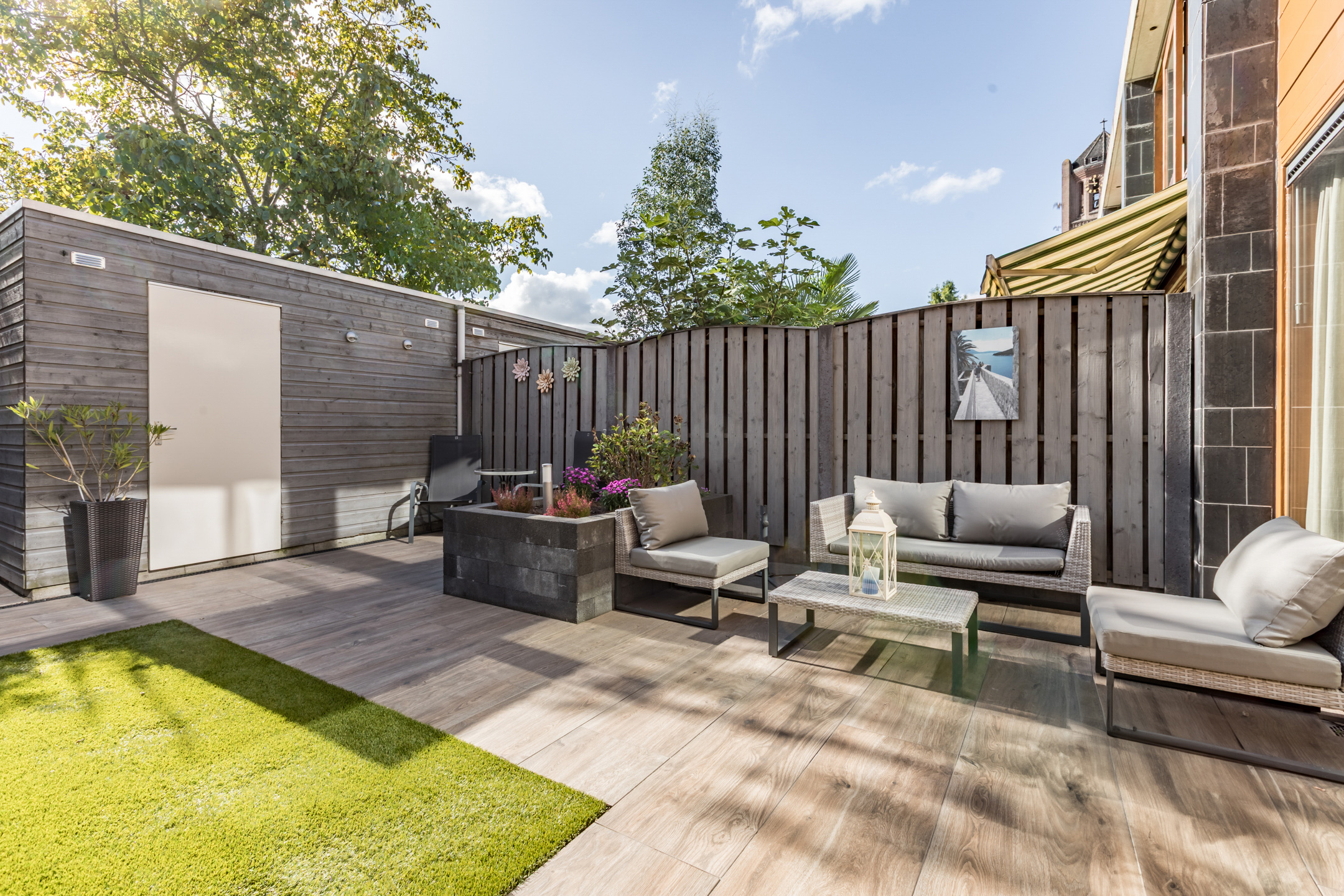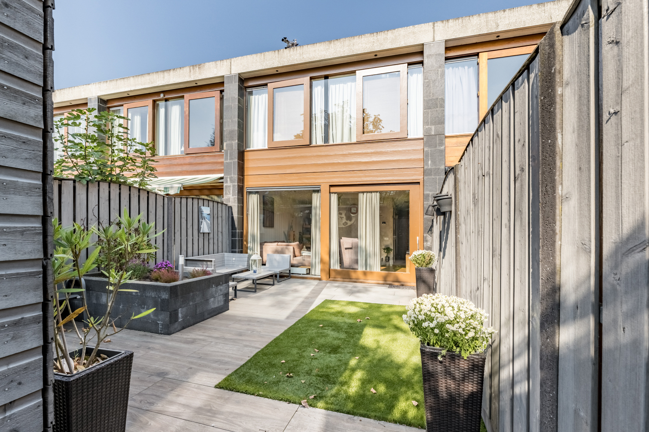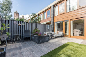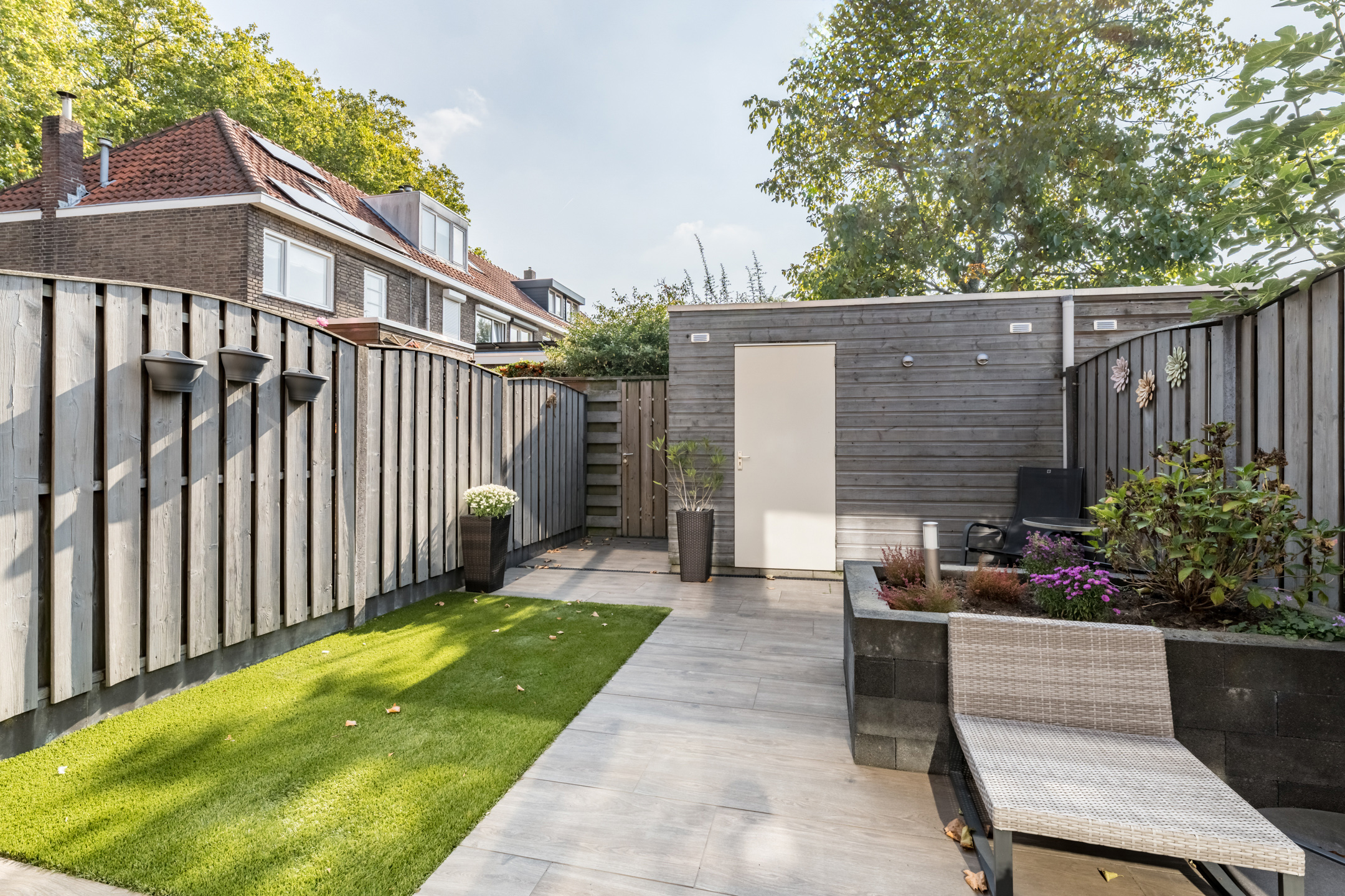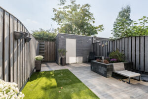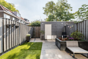 Gezellige en strak aangelegde (2017) achtertuin op het zuid oosten. De achtertuin is bestraat, voorzien van kunstgras, een borderbak, houten berging en een achterom.