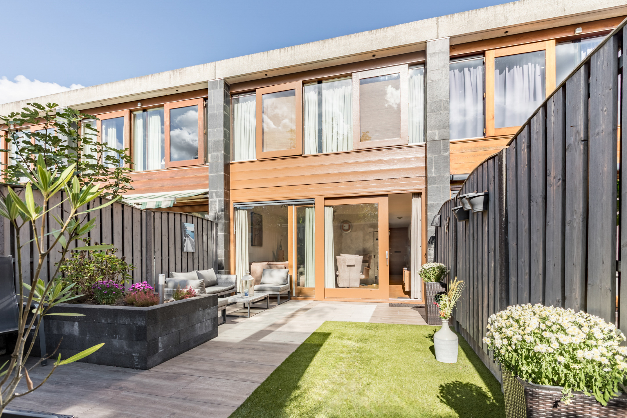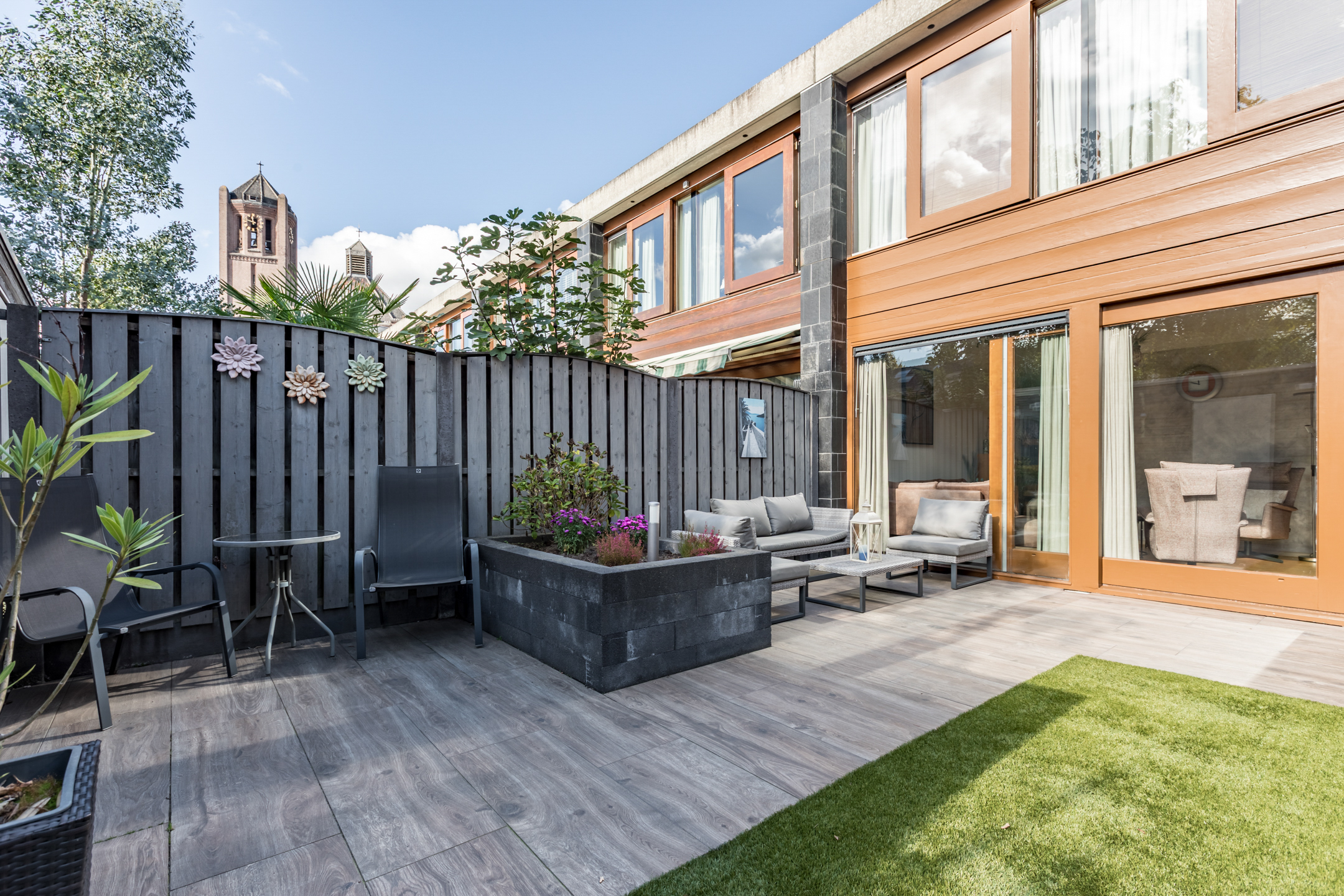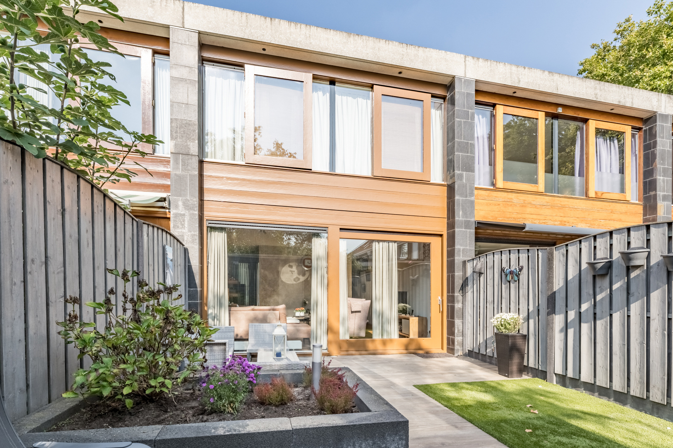 Gezellige en strak aangelegde (2017) achtertuin op het zuid oosten. De achtertuin is bestraat, voorzien van kunstgras, een borderbak, houten berging en een achterom.