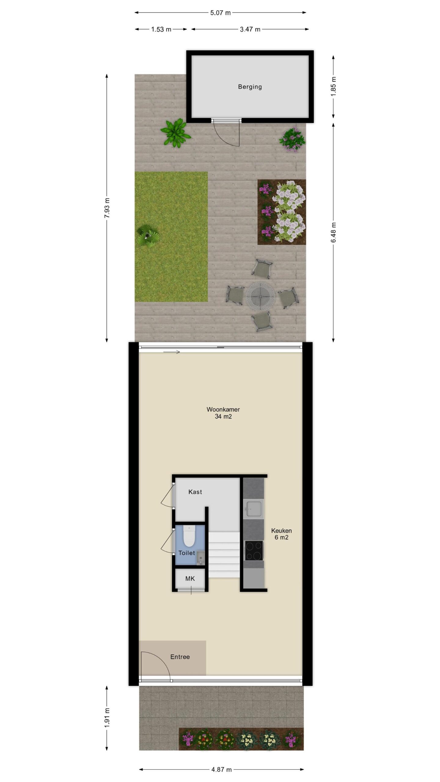 Via de voortuin is de entree van de woning te bereiken.