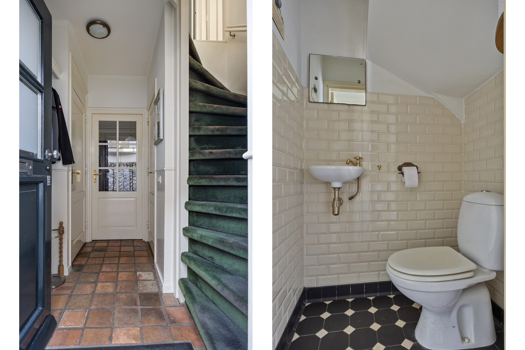 Entree, hal met tegelvloer, de meterkast, het toilet met fonteintje en een garderobe hoek. De hal geeft toegang tot de woonkamer.