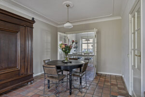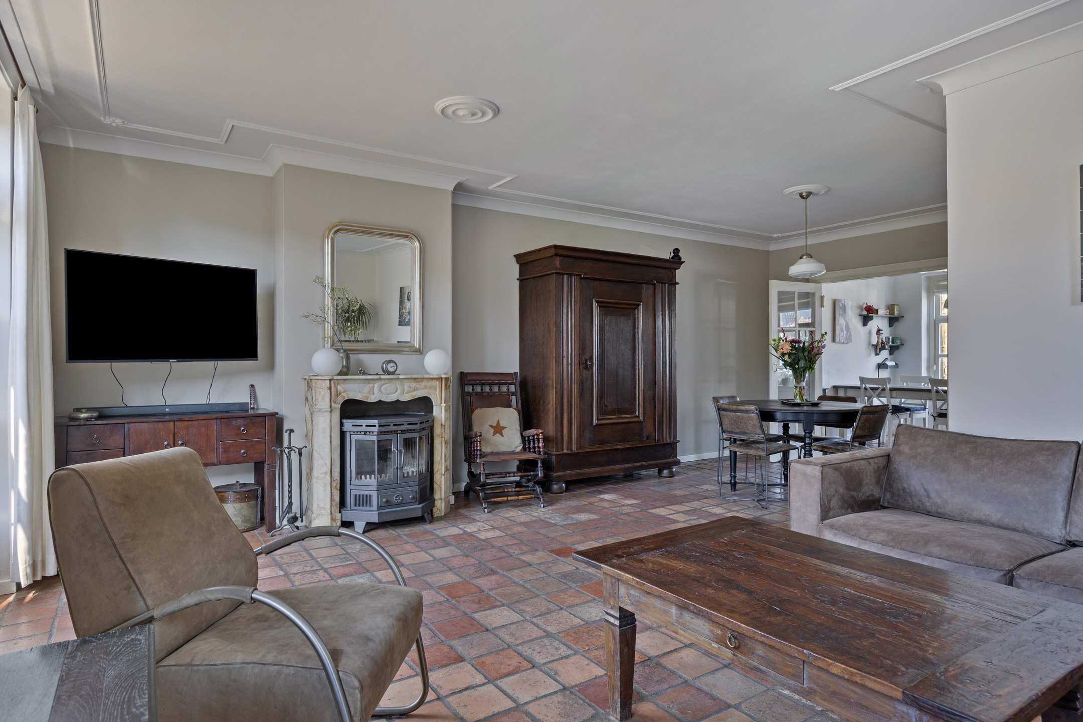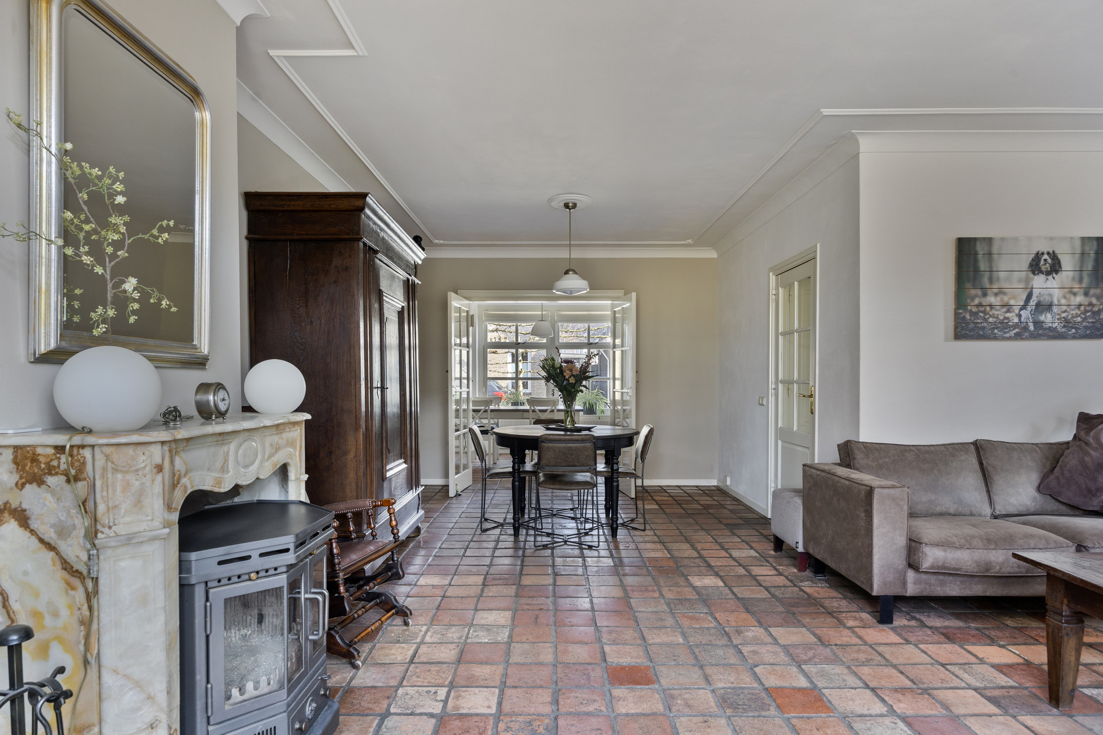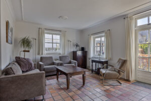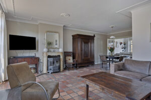 Royale woonkamer van circa 33 m² met tegelvloer voorzien van vloerverwarming, sfeervol plafond met sierlijsten, houtkachel en twee openslaande tuindeuren.