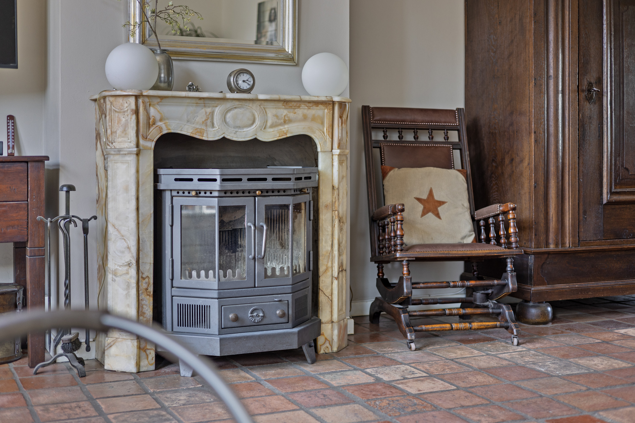 • Lichte woonkamer met houtkachel.