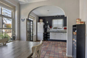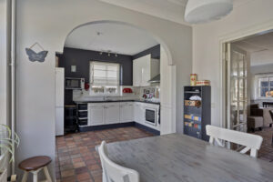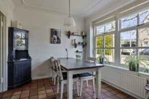 Dichte woonkeuken van circa 19 m² met tegelvloer met vloerverwarming en keukeninrichting in hoekopstelling. De keukeninrichting is voorzien van een spoelbak, inductiekookplaat, afzuigkap en een oven (deze werkt niet meer). De keuken en woonkamer zijn met elkaar verbonden via prachtige kamer-en-suite deuren, deze voegen karakter toe en zorgen ervoor dat je de ruimtes flexibel kunt gebruiken.