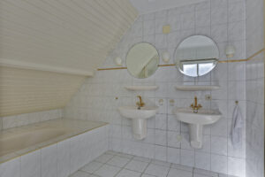 De ruim opgezette badkamer is voorzien van een ligbad, dubbele wastafel, douche en toilet.