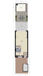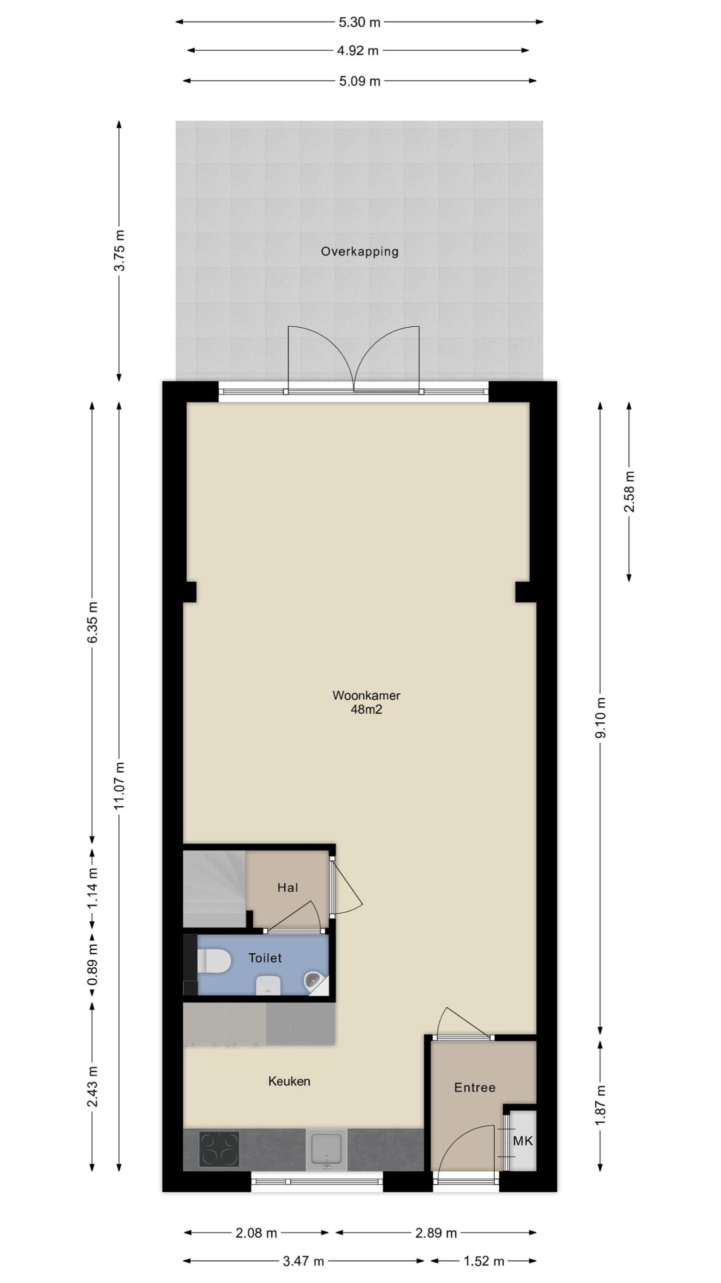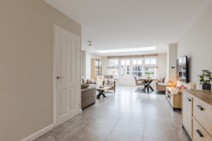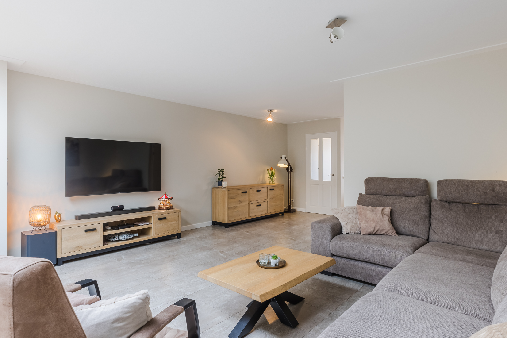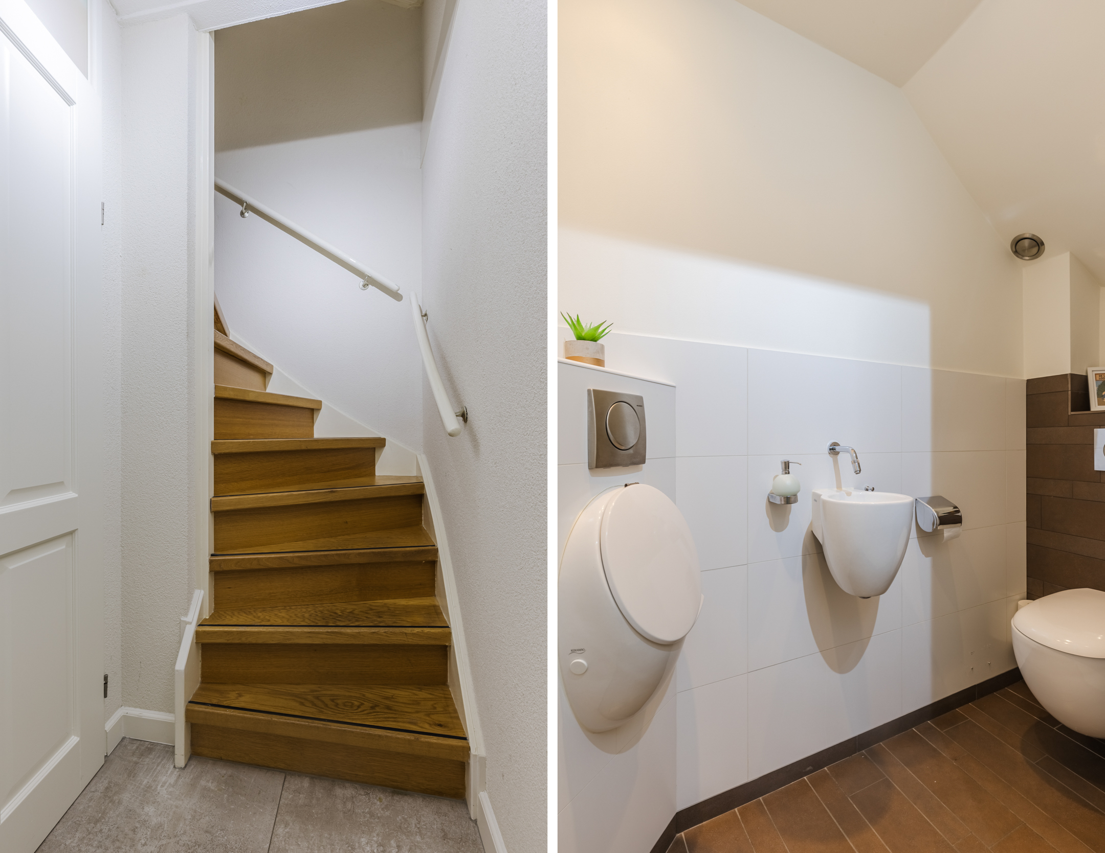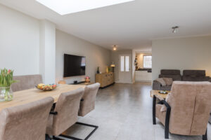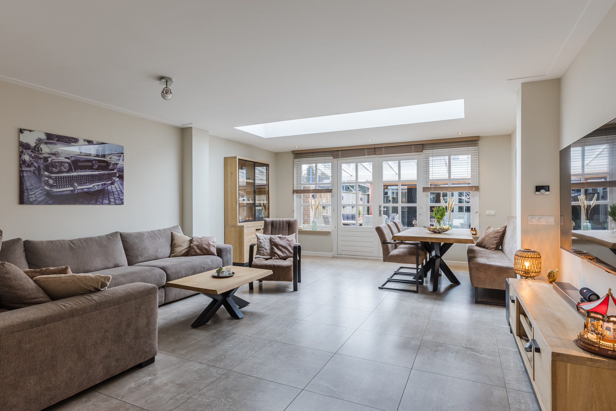 De royale woonkamer (inclusief keuken) van ca. 48 m² met tegelvloer voorzien van vloerverwarming, volledig gestucte wanden en plafond, een lichtstraat en openslaande tuindeuren. De indeling is praktisch met een portaal naar de trap en het modern afgewerkte toilet, voorzien van een vrij hangend closet, fonteintje, nette tegelvloer en een urinoir.