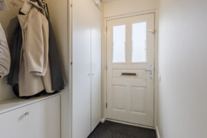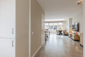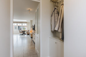 Entree, hal met tegelvloer, de meterkast (ca. 4 jaar geleden vernieuwd) verdeler van de vloerverwarming en een garderobe hoek. De woning is aangesloten op Stadsverwarming. De hal geeft toegang tot de woonkamer en keuken.