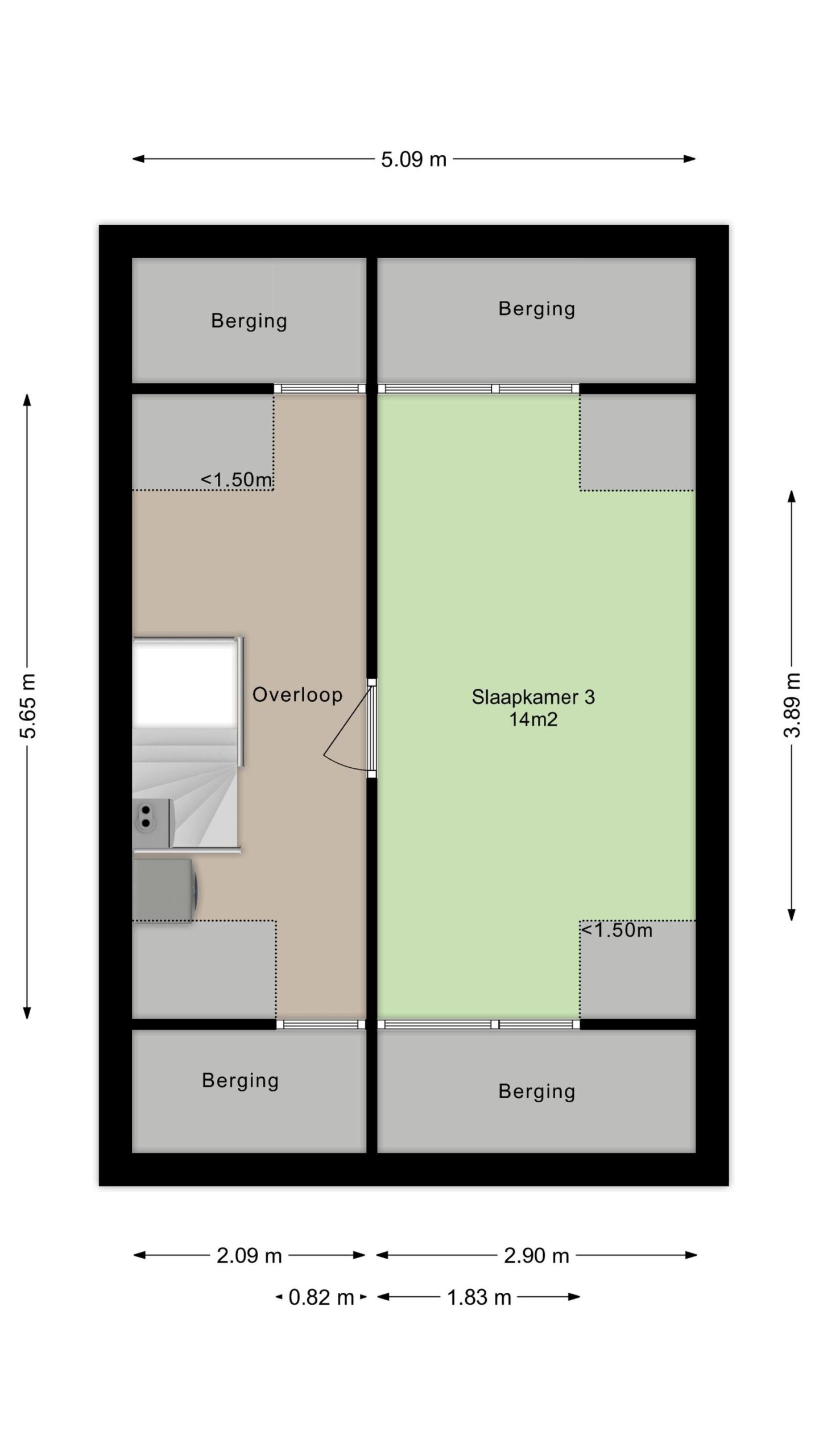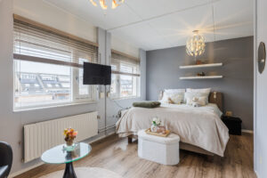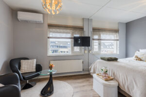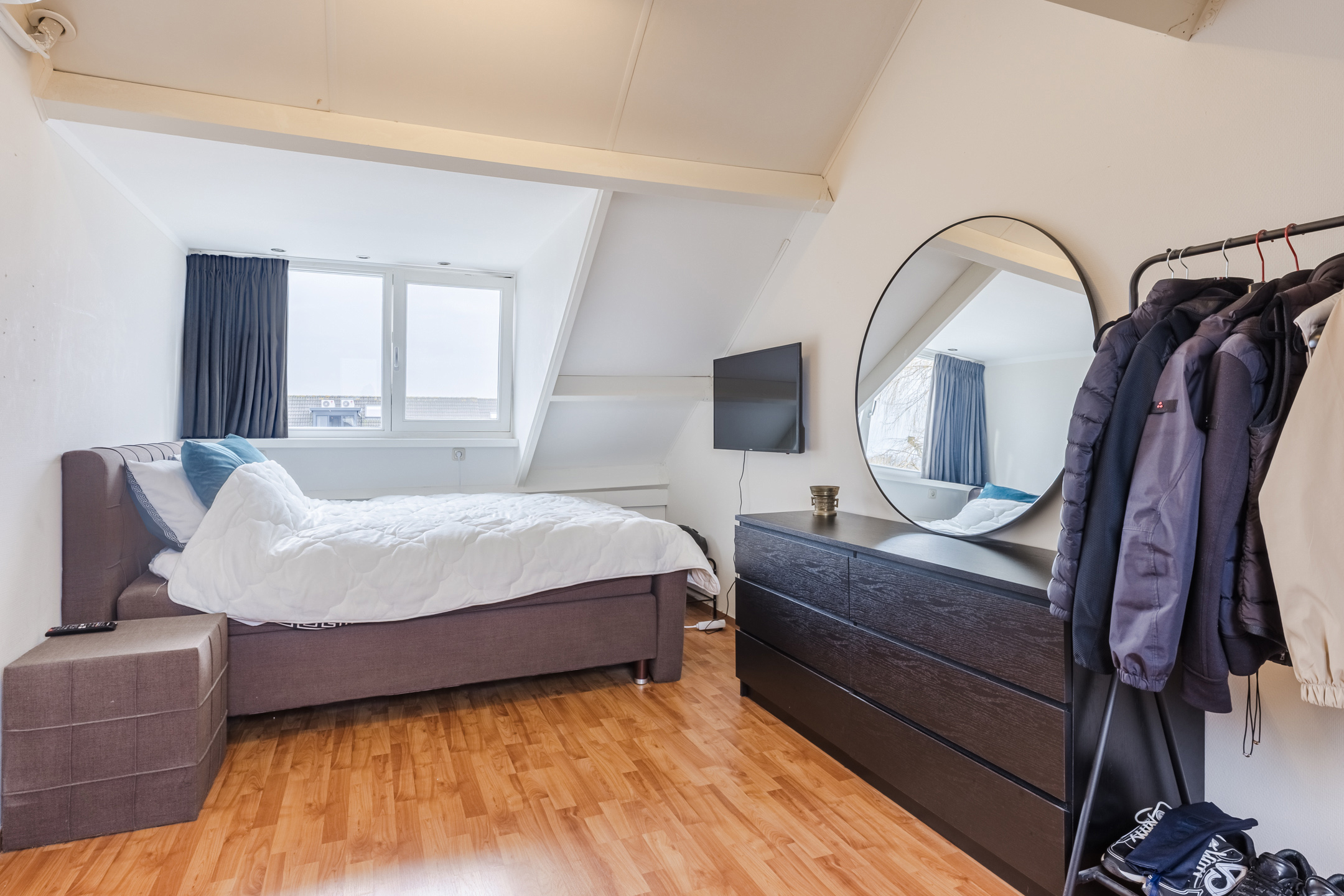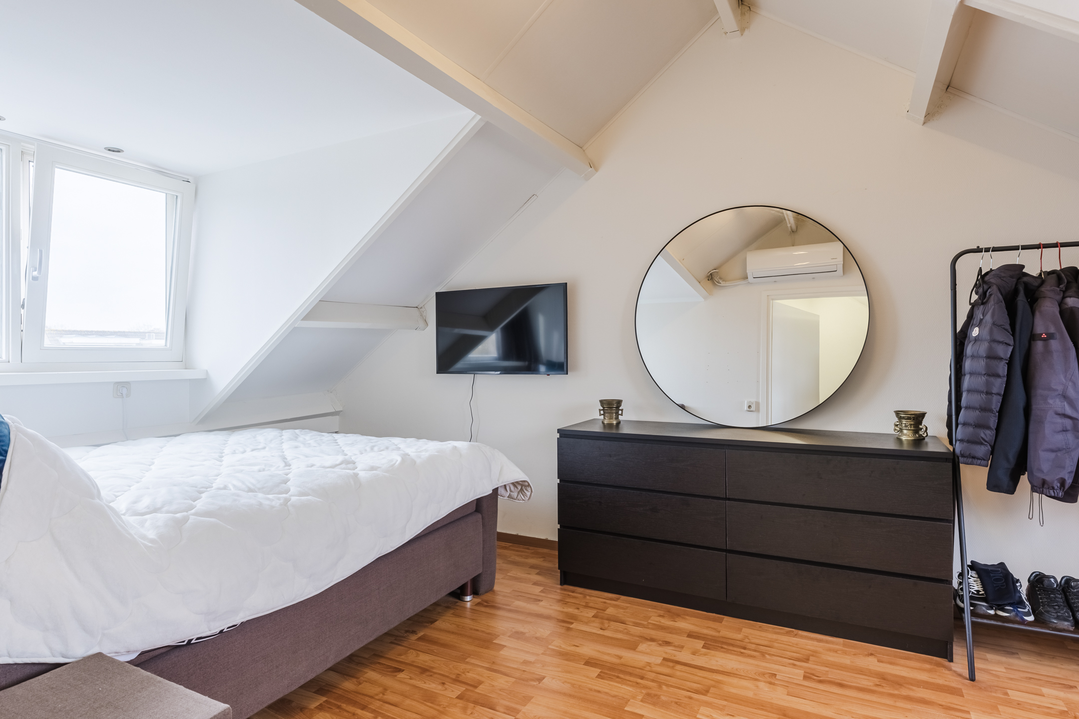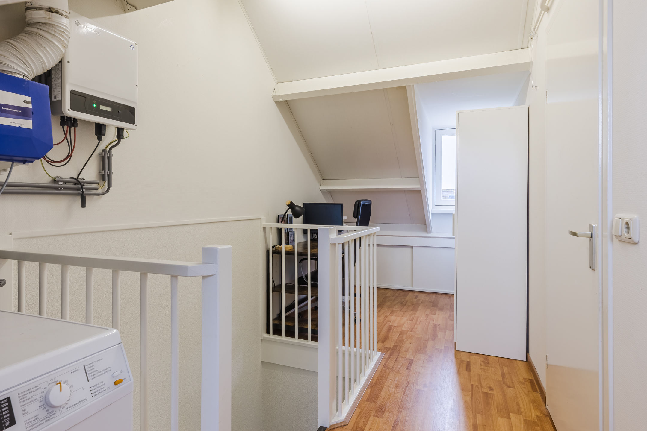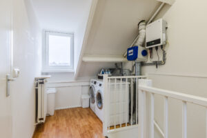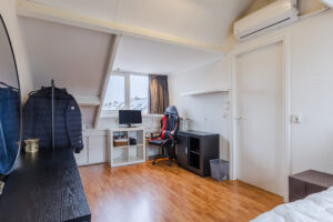 De zolder is verrassend ruim dankzij twee dakkapellen, één aan de voorzijde en één aan de achterzijde, wat zorgt voor extra stahoogte en veel natuurlijk licht. De slaapkamer is voorzien van een laminaatvloer, behang en airconditioning. De voorzolder beschikt over de aansluiting voor de wasmachine en droger, de mechanische ventilatie en de omvormer van de zonnepanelen. Hier loopt de dakkapel aan beide zijde door, wat zorgt voor extra ruimte en natuurlijk licht.