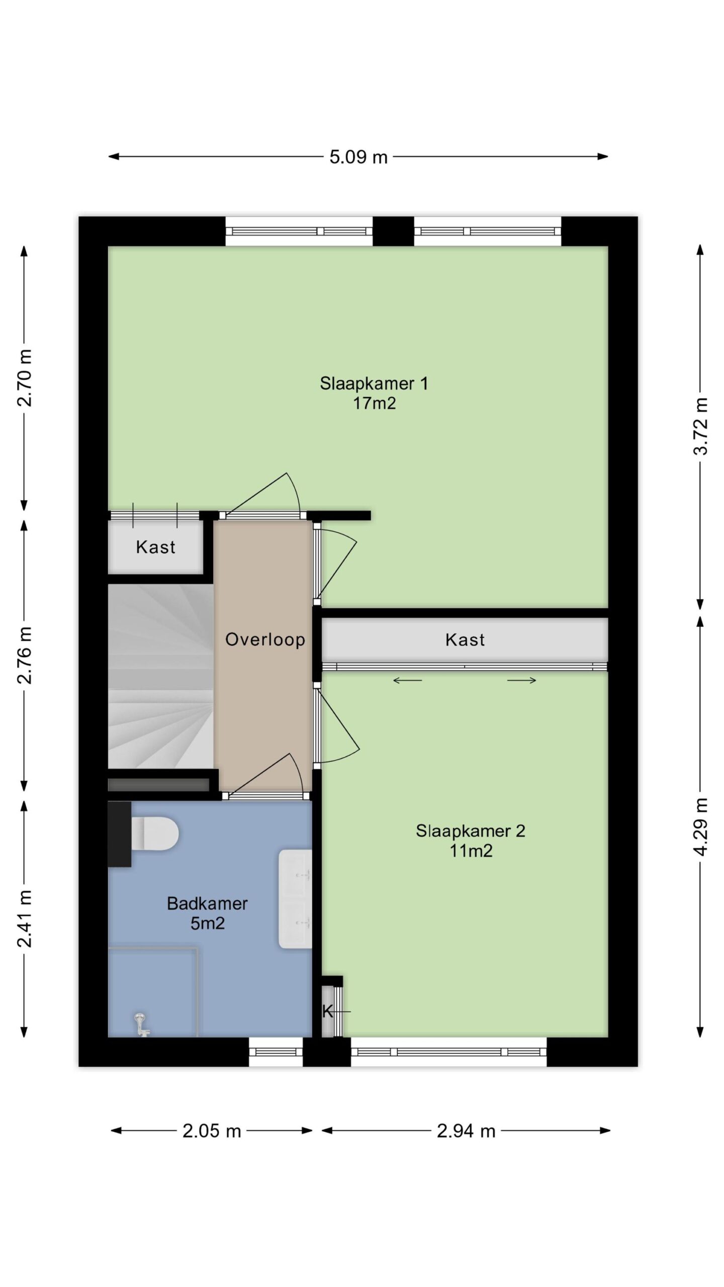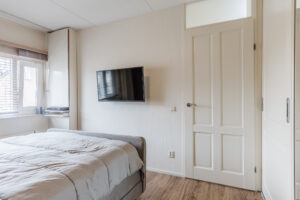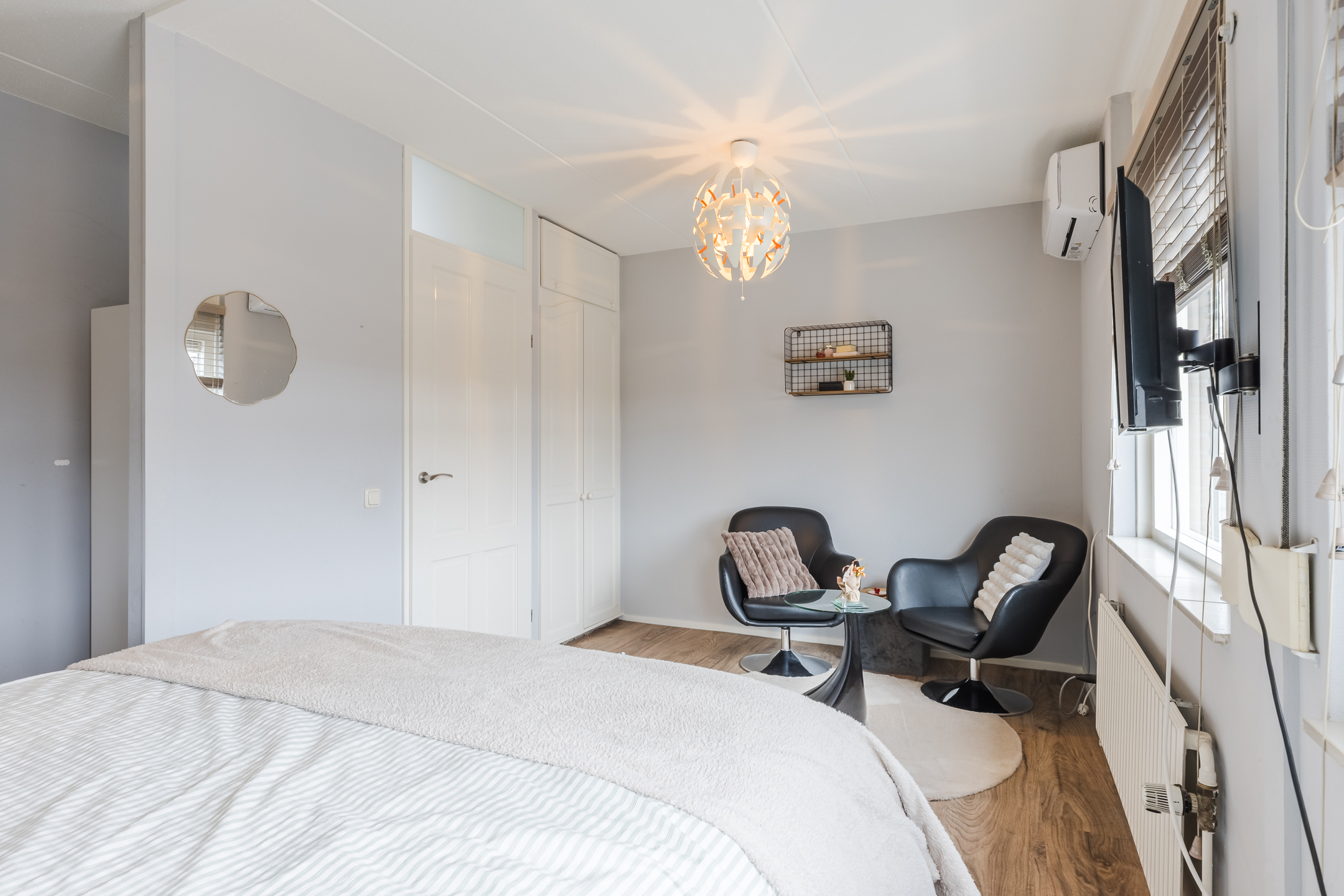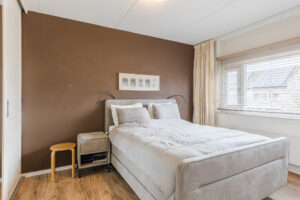 De slaapkamer aan de voorzijde is voorzien van een PVC-vloer, glasvlies behang en eveneens een inbouwkast. Alle ramen op de eerste verdieping zijn voorzien van rolluiken.