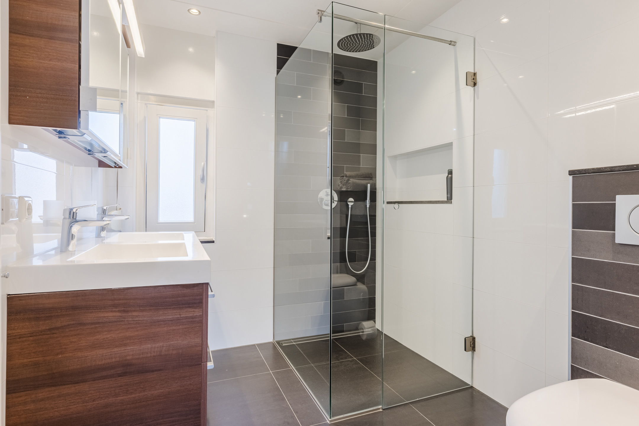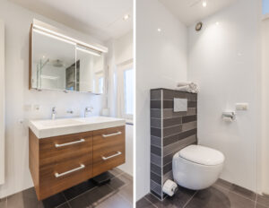 De badkamer is modern en stijlvol uitgevoerd met een grijze tegelvloer, witte wandtegels, vloerverwarming, een dubbele wastafel, designradiator, inbouwspots in een gestuct plafond.