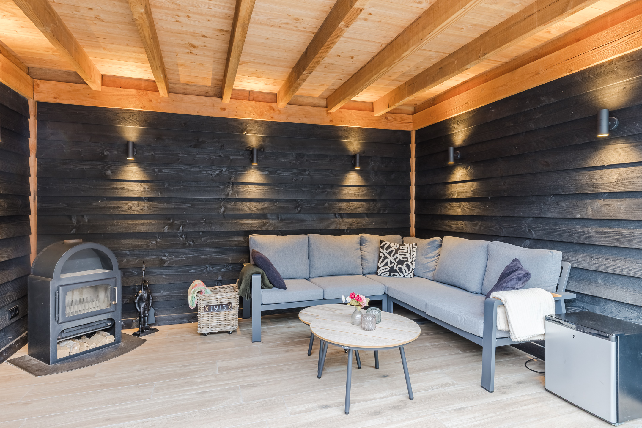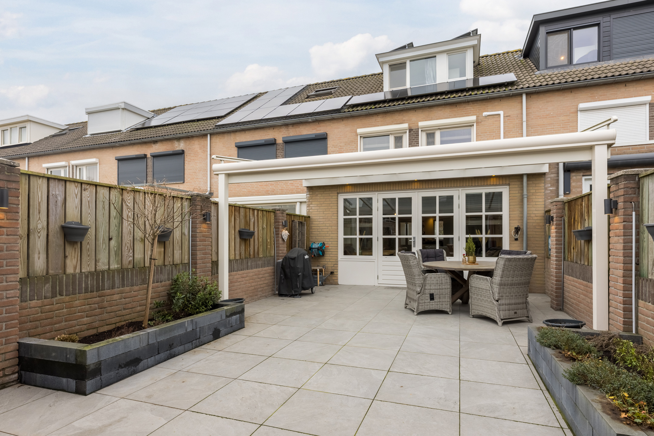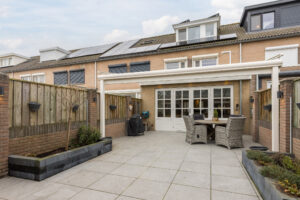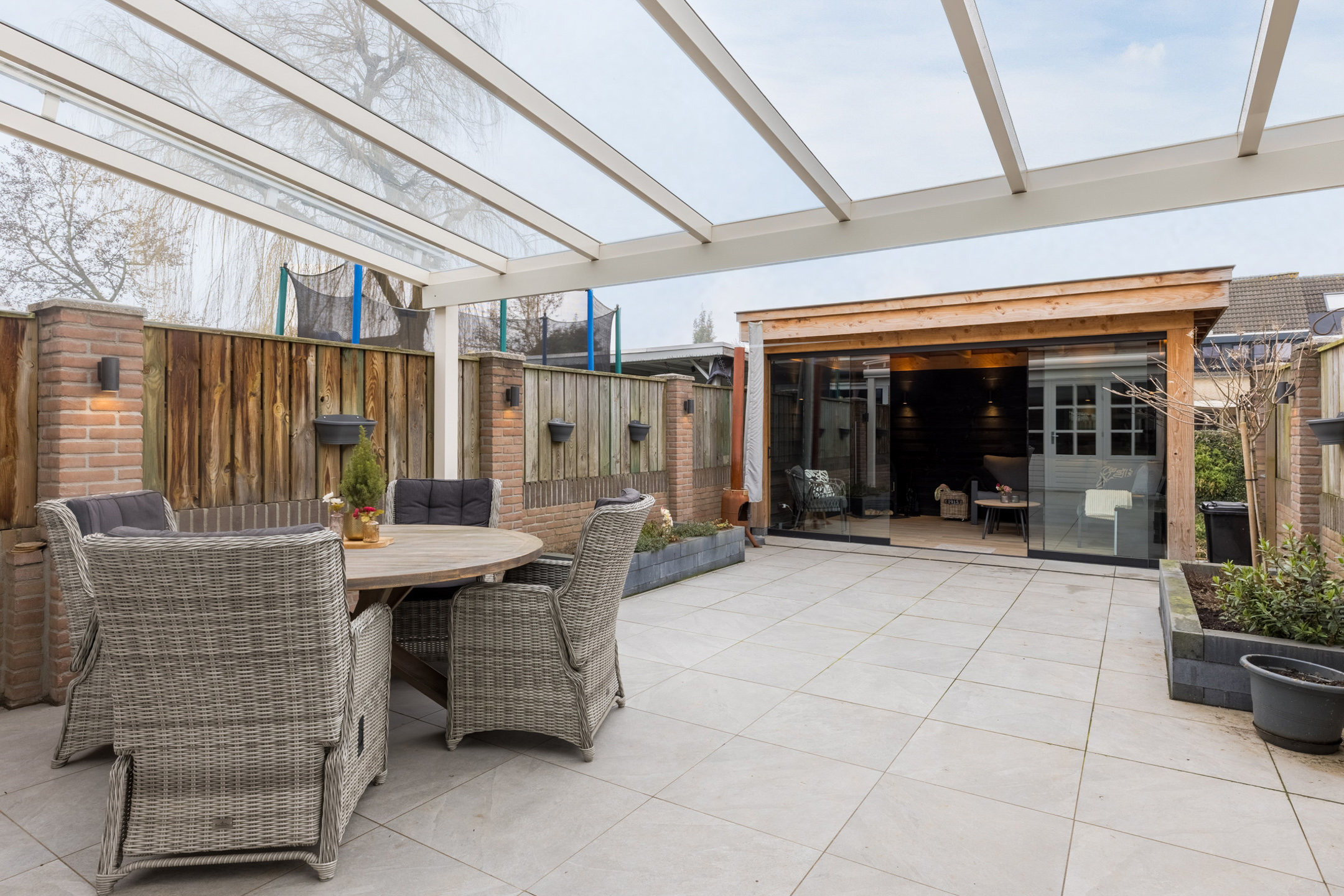 Aan de achterzijde bevindt zich een prachtige overkapping die volledig met glas kan worden afgesloten. Deze ruimte is voorzien van dimbare verlichting, spotjes, tv-aansluiting, leidingwerk en afvoer voor een eventuele buitenkeuken en keramische tegels over een geïsoleerde betonnenvloer.