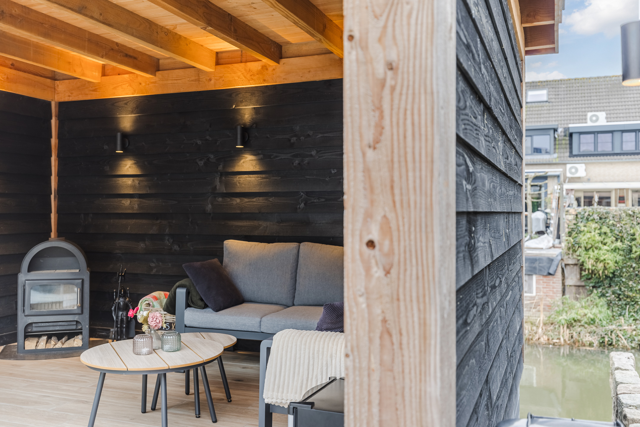 Achter de overkapping ligt water, bereikbaar via een trapje.