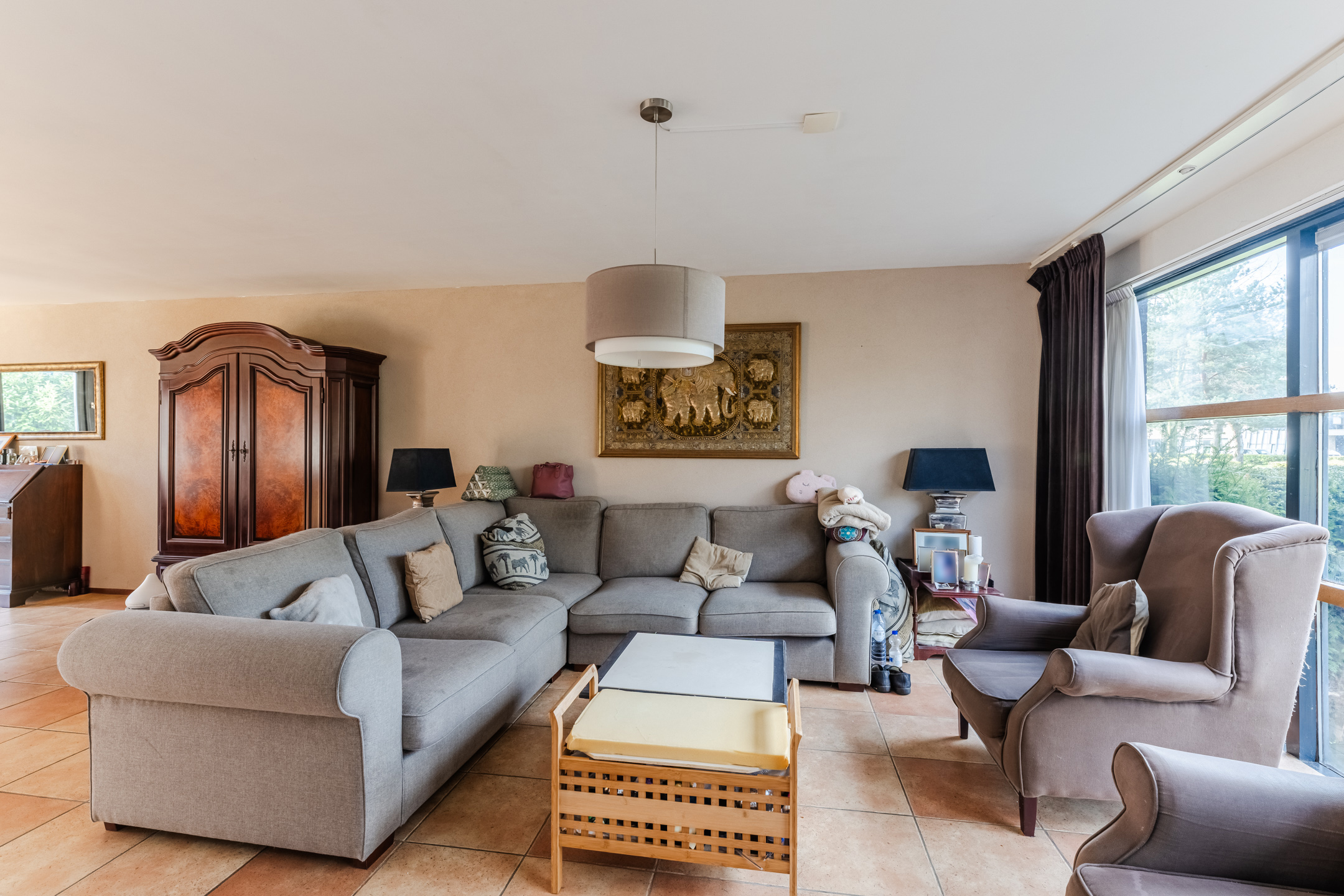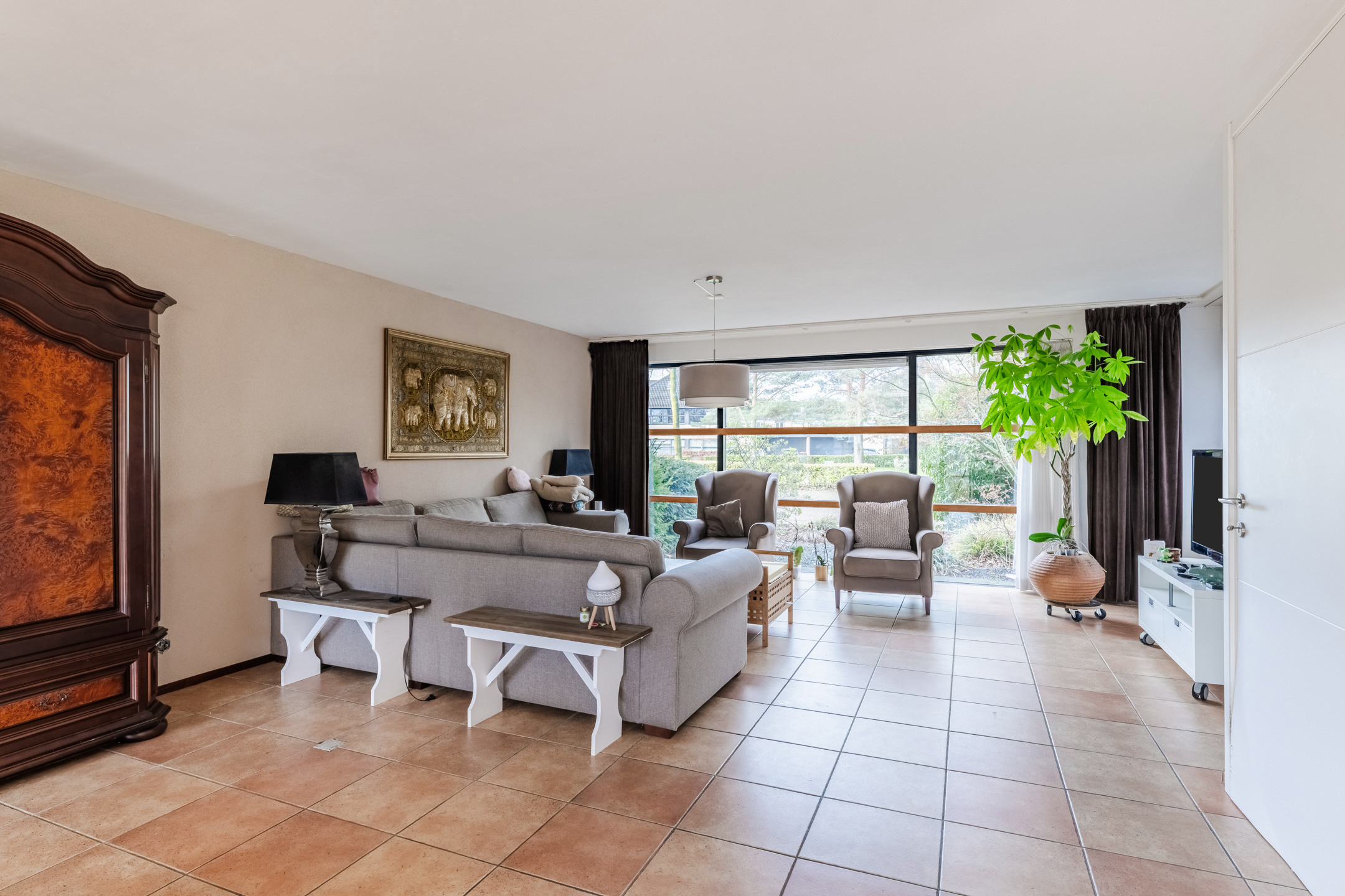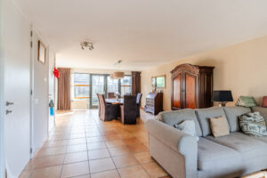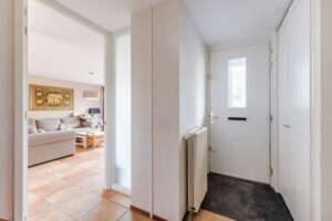 De hal, woonkamer en keuken zijn voorzien van een nette tegelvloer met vloerverwarming, Spachtelputz wanden en gestuct plafond.