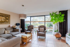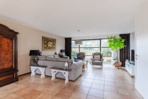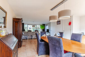 De zeer riante woonkamer van ca. 56 m² (exclusief keuken) geniet van veel natuurlijk licht door de grote raampartijen aan zowel de voorzijde als de achterzijde van de woning. De raampartijen aan de voorzijde geven u tevens een panorama uitzicht over het groenrijke Makkumplein. De woonkamer is voorzien van een praktische trapkast, inbouwspotjes en openslaande tuindeuren naar de achtertuin.
