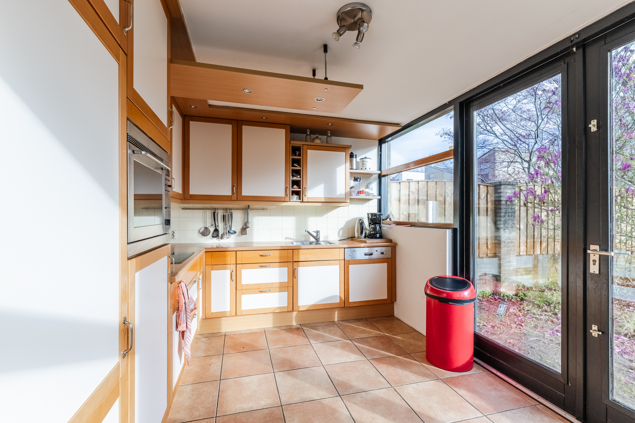 De halfopen keuken geniet eveneens van veel natuurlijk lichtinval door de raampartijen welke zijn doorgetrokken vanuit de woonkamer. De keuken is hier geplaatst in een L-opstelling en beschikt over verschillende onder- en bovenkasten. Daarnaast treft u hier een 1,5 spoelbak, inductiekookplaat (2025), afzuigkap, vaatwasser, koel-/vriescombinatie, combioven, betegelde achterwand en inbouwspots. Vanuit de keuken zijn zowel de bijkeuken als achtertuin te bereiken.