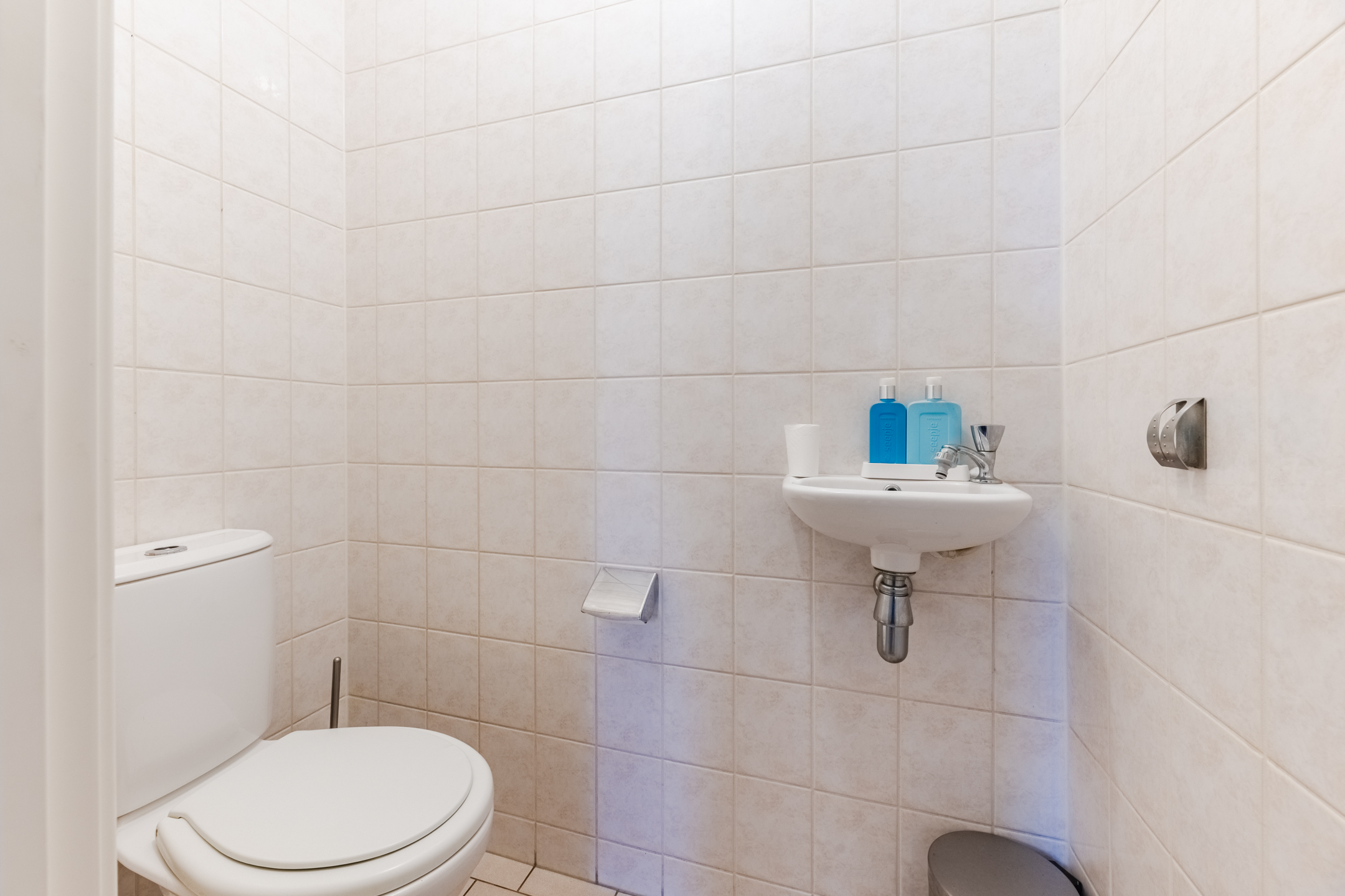 De geheel betegelde toiletruimte is uitgevoerd met een standaardtoilet, mechanische ventilatie en fonteintje.
