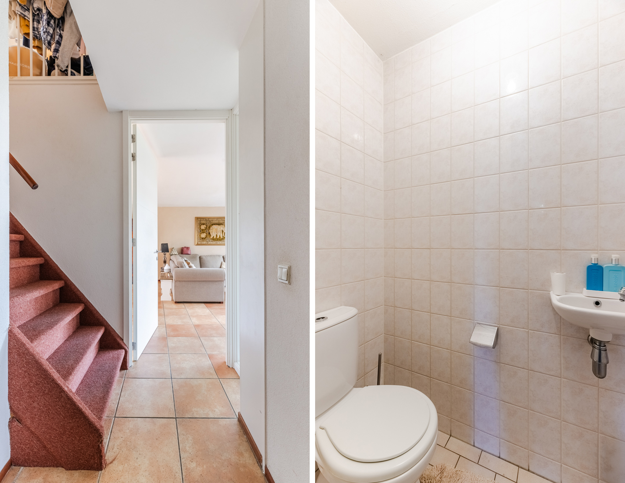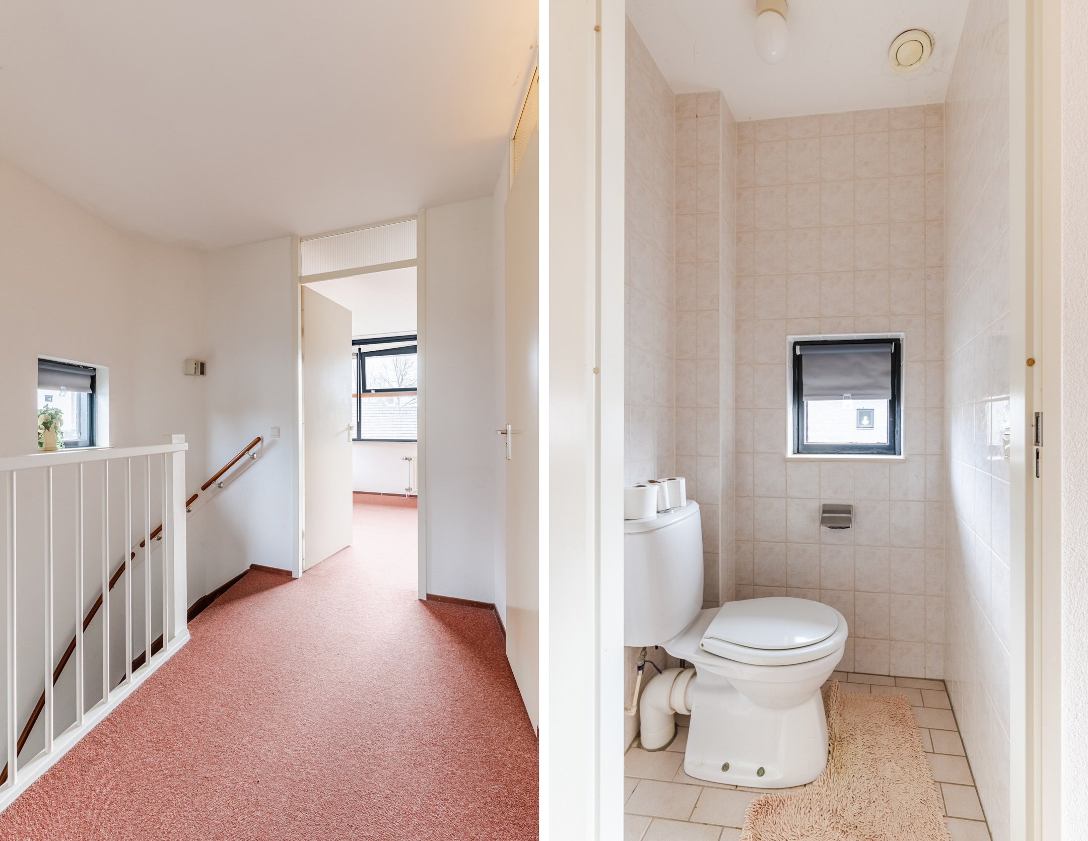 De separate toiletruimte op de eerste verdieping is geheel betegeld in een neutrale kleurstelling en beschikt over een standaard toilet met een raam voor de natuurlijke ventilatie.