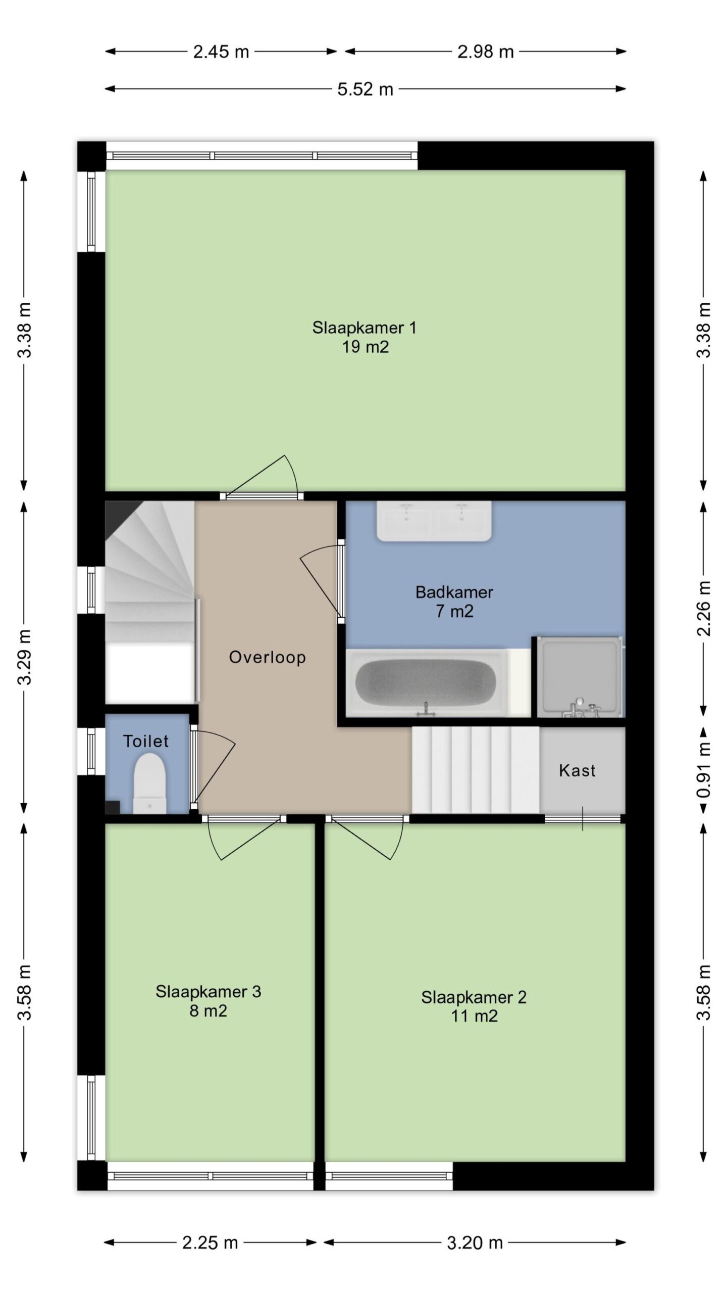 De drie slaapkamers zijn royaal van opzet met afmetingen van ca. 19 m², 11m² en 8 m². De slaapkamer aan de voorzijde beschikt over een handige inbouwkast.