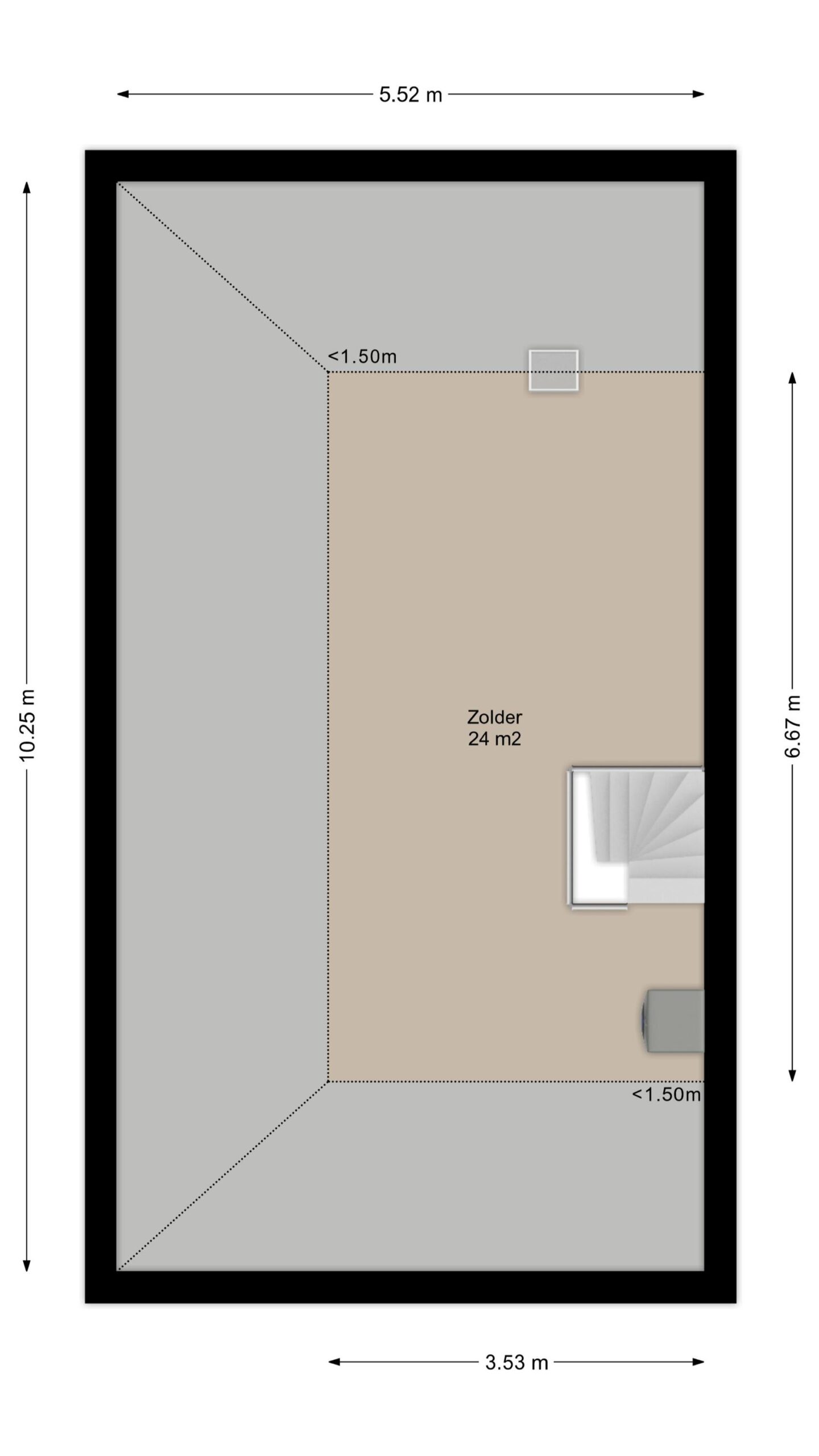 Deze verdieping is met ca. 24 m² wederom royaal te noemen. Doordat er wordt uitgekeken op de kapconstructie heeft u hier een bijzonder ruimtelijk gevoel. Deze verdieping is multifunctioneel in gebruik. Zo is deze ruimte geschikt voor bijvoorbeeld een ruime thuiswerkplek of speelkamer. Met enige aanpassingen kunnen hier ook twee extra slaapkamers worden gerealiseerd. Deze verdieping beschikt over vloerbedekking, aansluiting voor de witgoedapparatuur, dakraam en hier is de unit voor de mechanische ventilatie gesitueerd.
