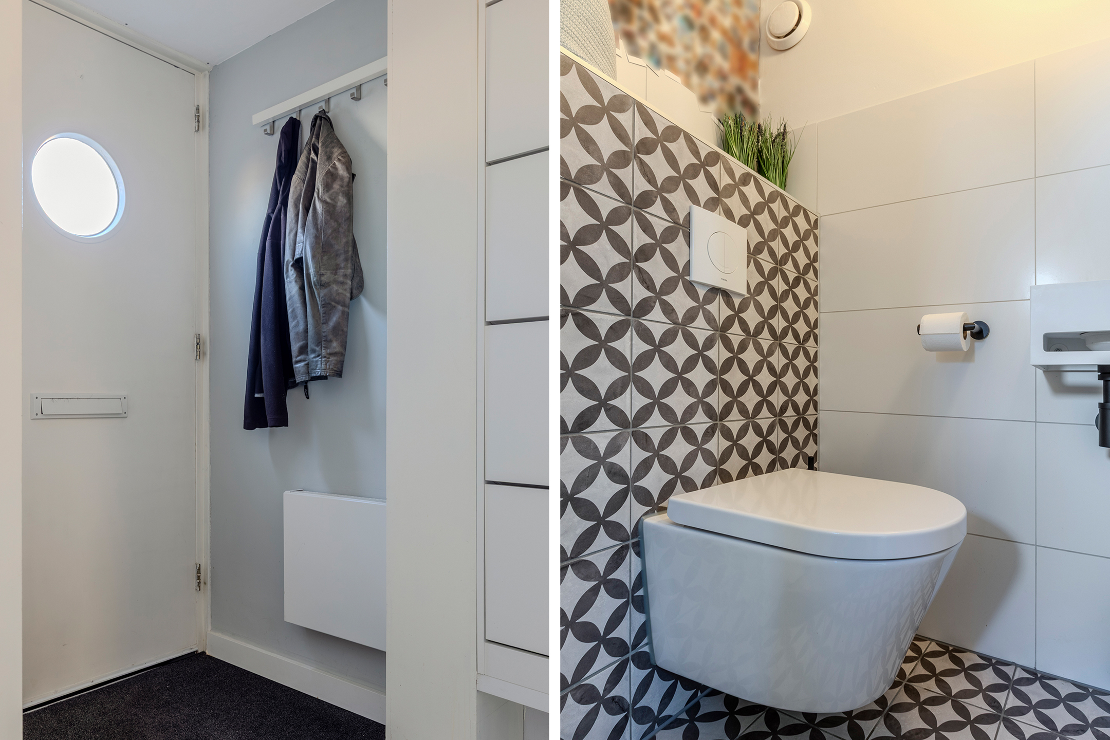 Entree, hal met eikenvloer, uitgebreide meterkast en een moderne toiletruimte voorzien van een vrij hangend toilet met fontein. De hal geeft toegang tot de woonkamer.