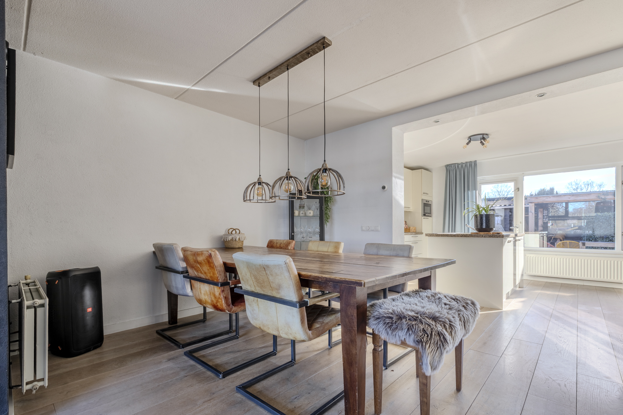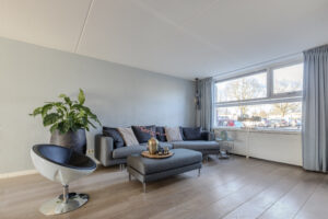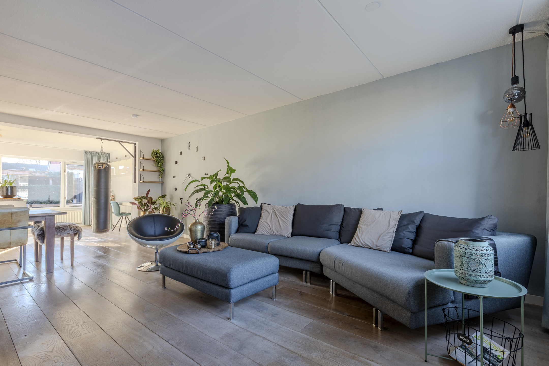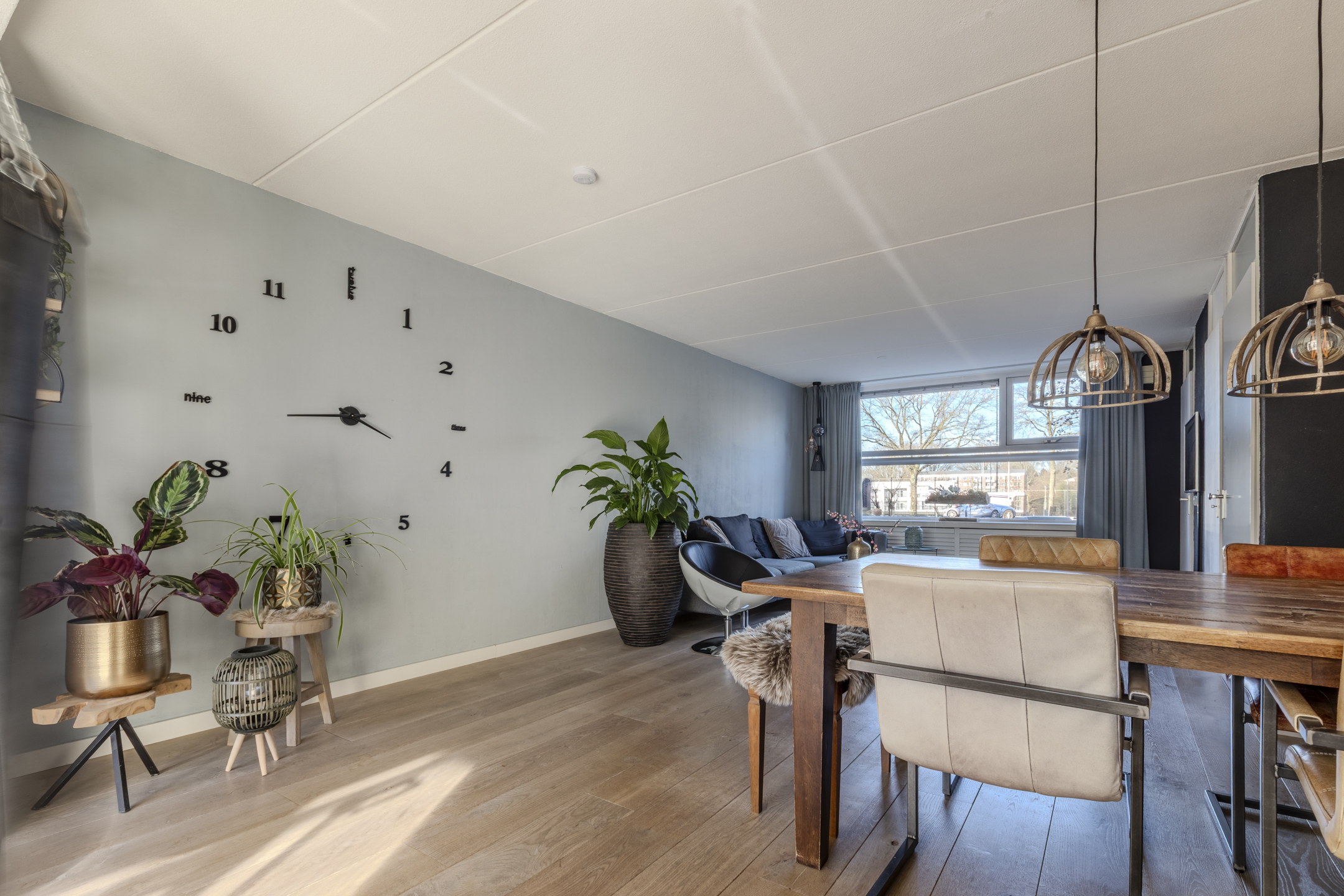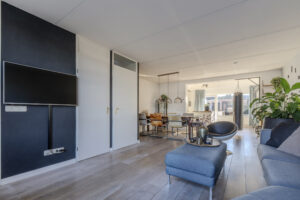 Sfeervolle en over de volle breedte uitgebouwde woonkamer circa 50m² (inclusief keuken) met eiken vloer en hoge witte plinten.