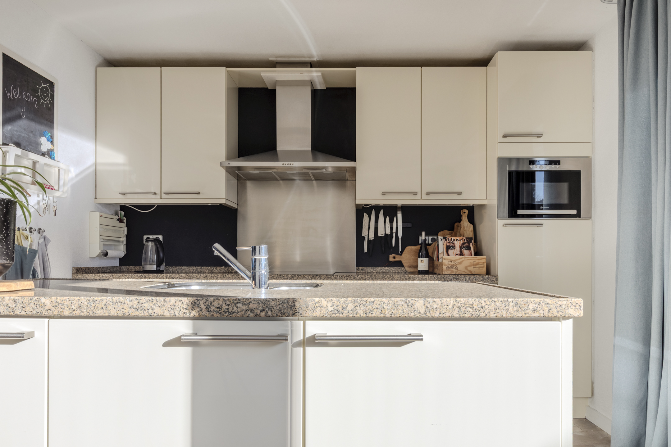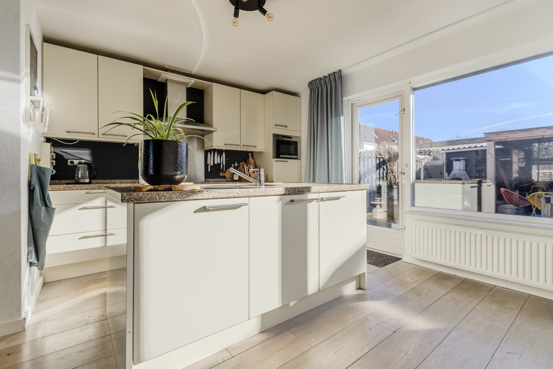 In de uitbouw bevindt zich een ruime open keuken die bestaat uit een moderne keukeninrichting met spoeleiland. De keukeninrichting is voorzien van een granieten blad, 1,5 spoelbak, inductie kookplaat, afzuigkap, koelkast, 3-lades vriesvak, oven, magnetron en een vaatwasser.