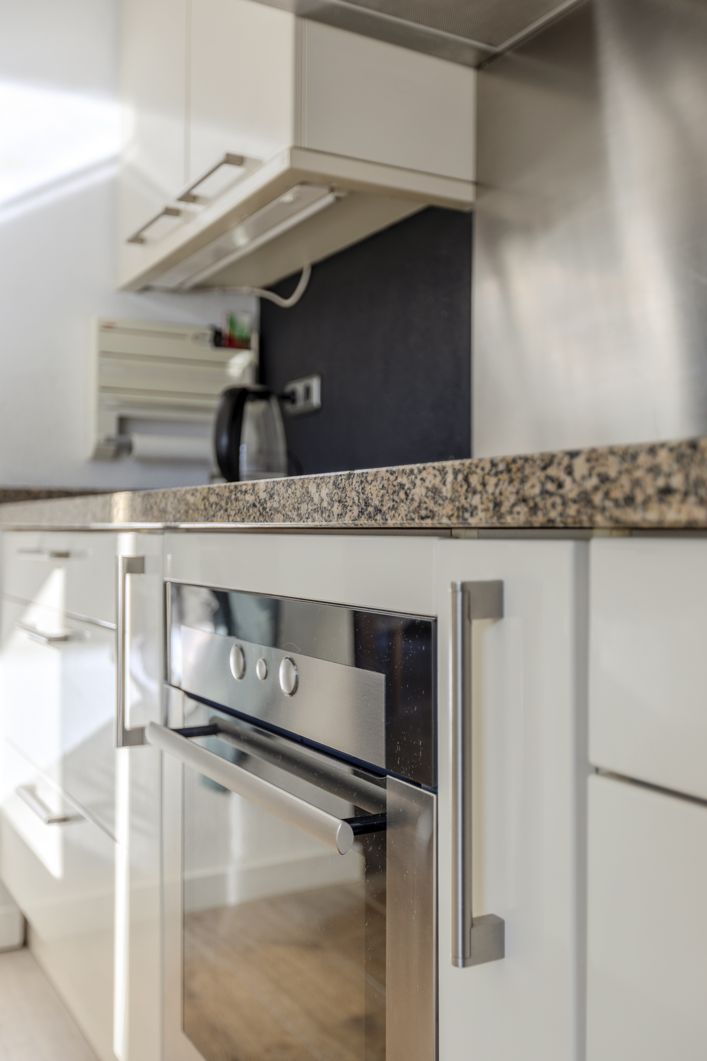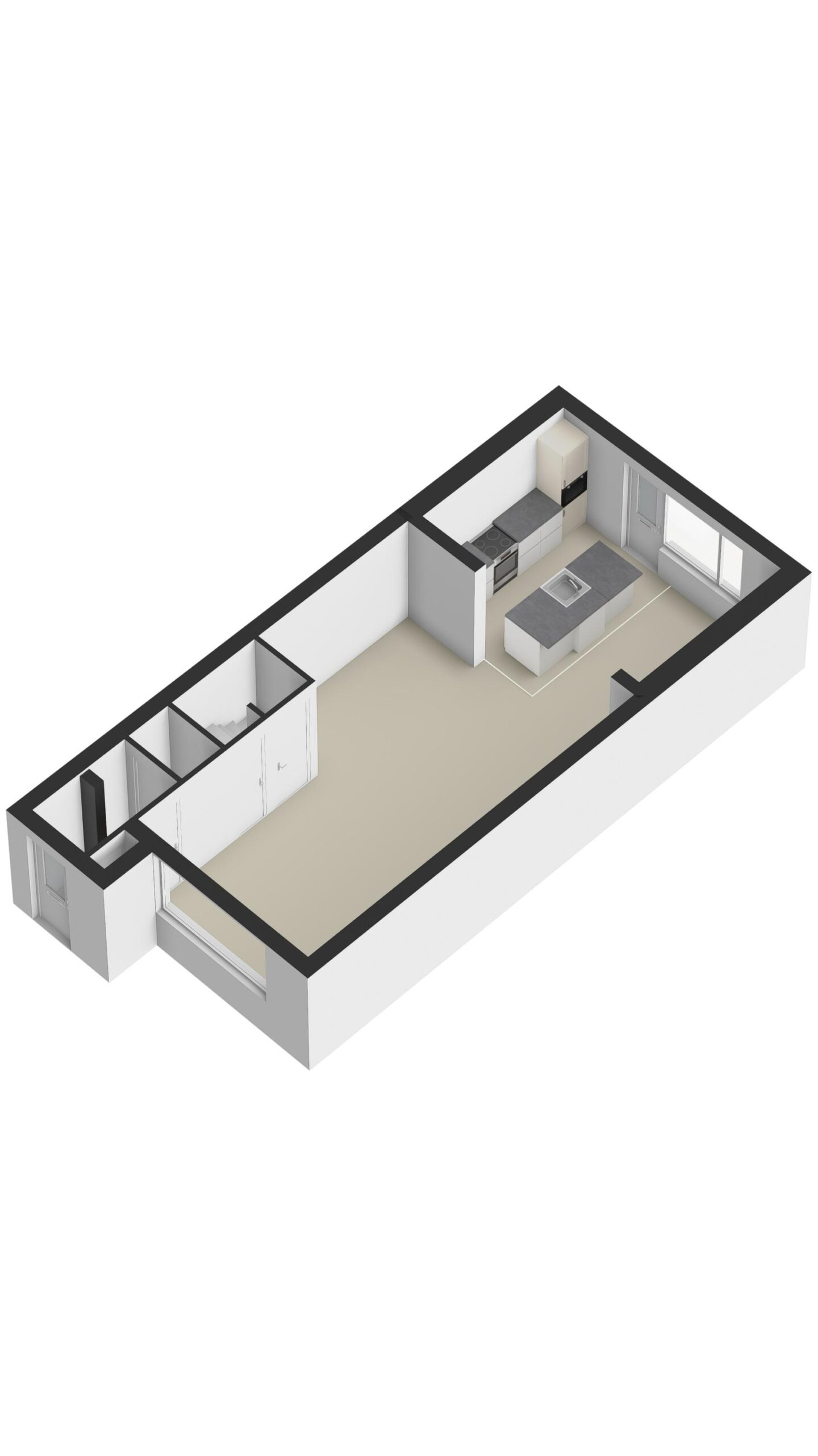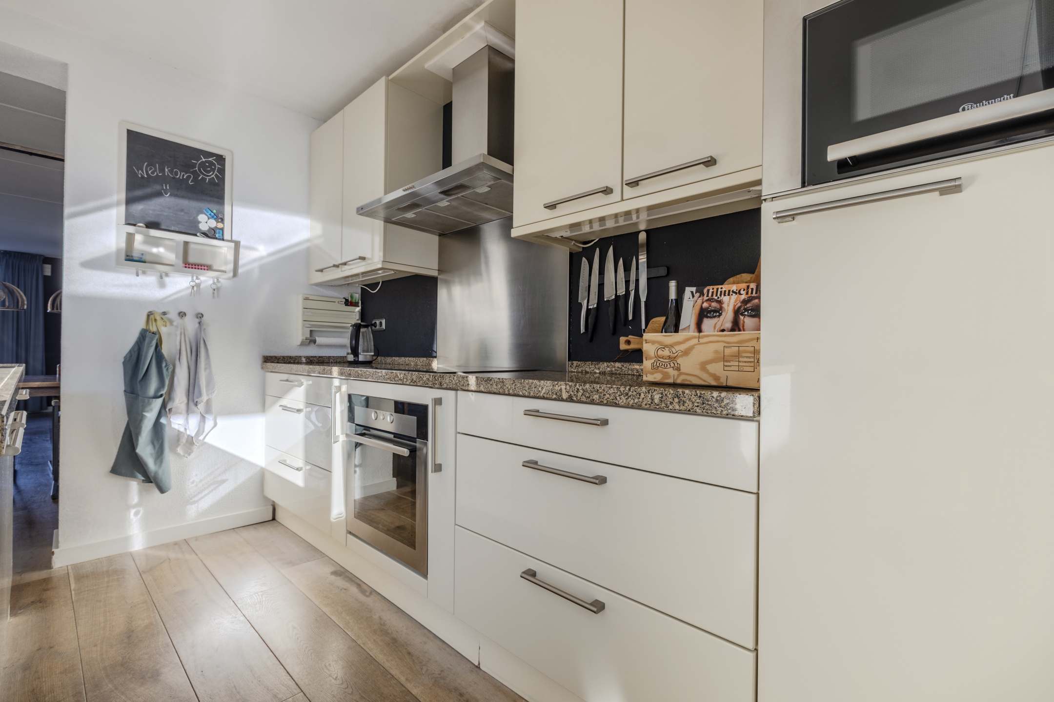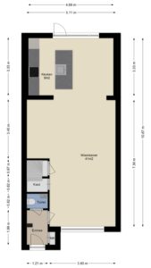 Gezien de grootte van de keuken bevindt zich aan de andere zijde een open ruimte die ideaal gebruikt kan worden als werk-/ speelhoek met diverse ingebouwde kasten.