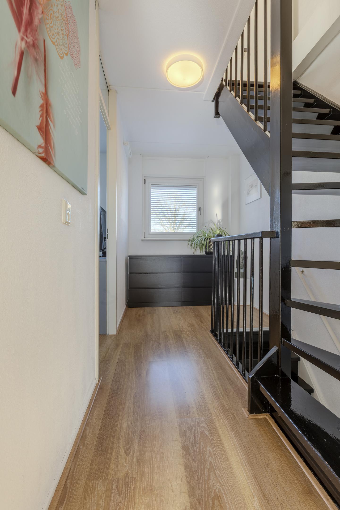 Overloop met laminaatvloer en die toegang geeft tot twee grote slaapkamers, de badkamer en een vaste kast.