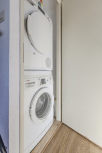 Vaste kast die gedeeltelijk is betegeld en voorzien van de aansluitingen voor de wasapparatuur.