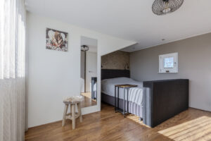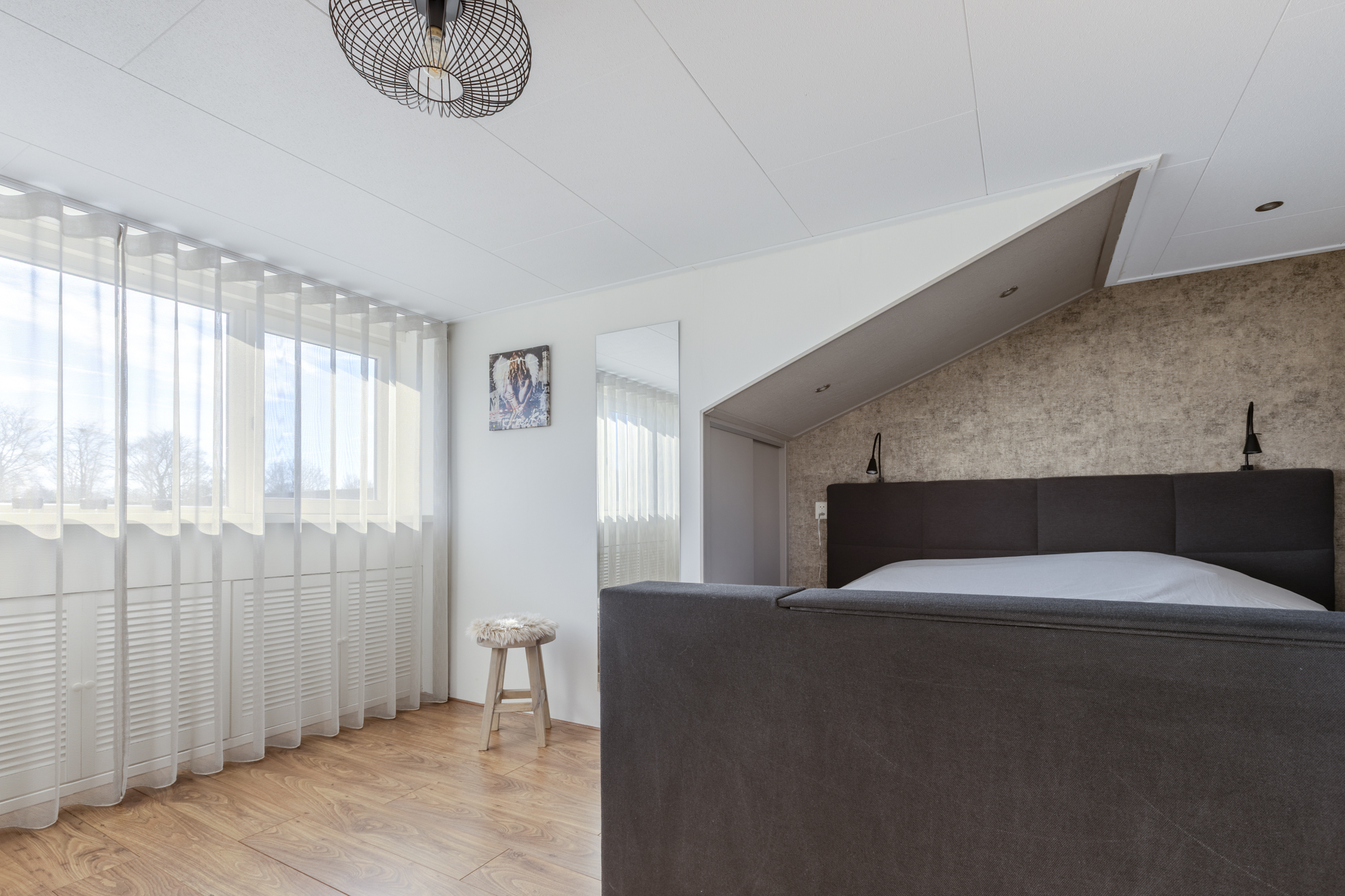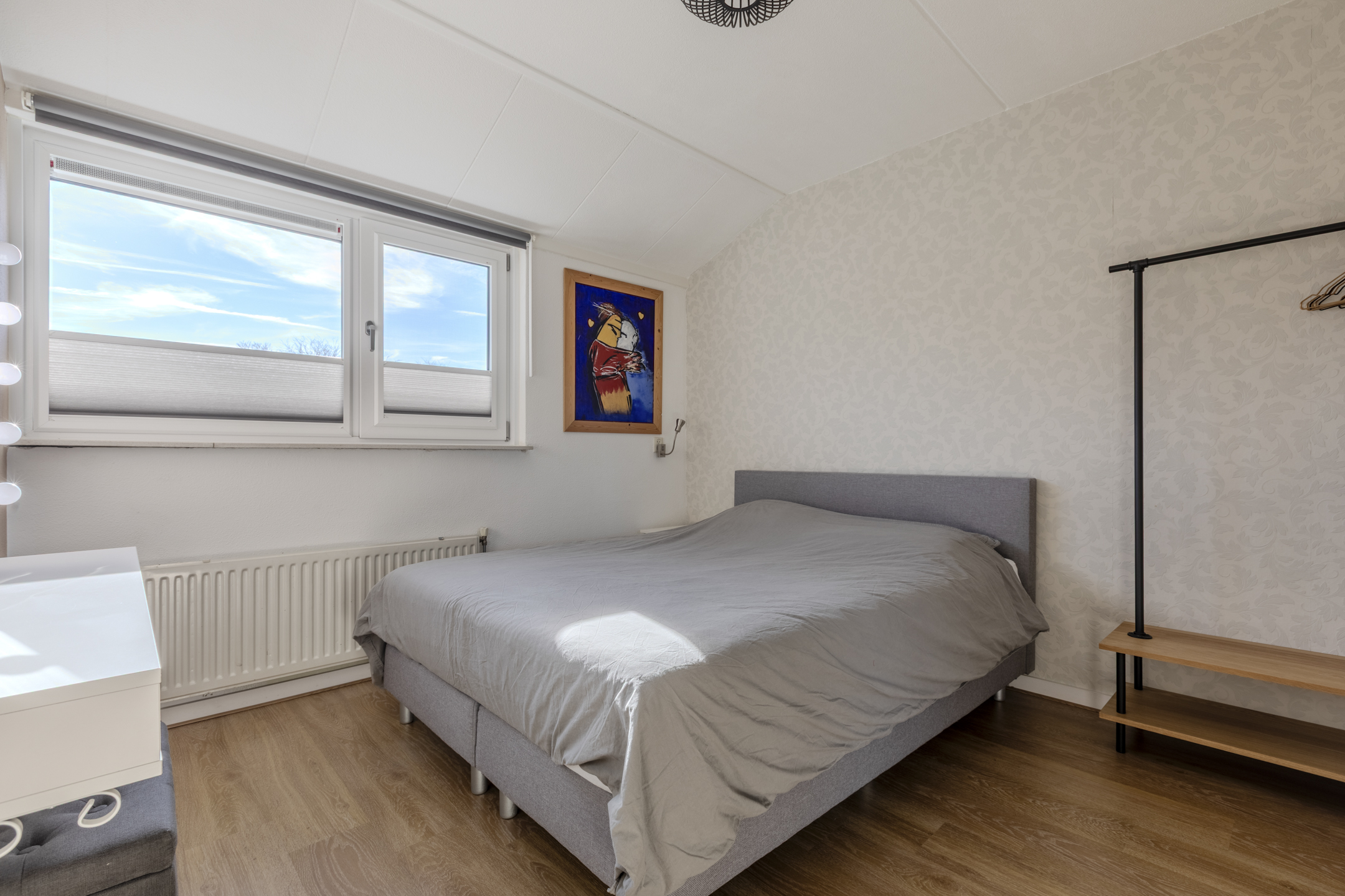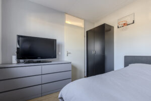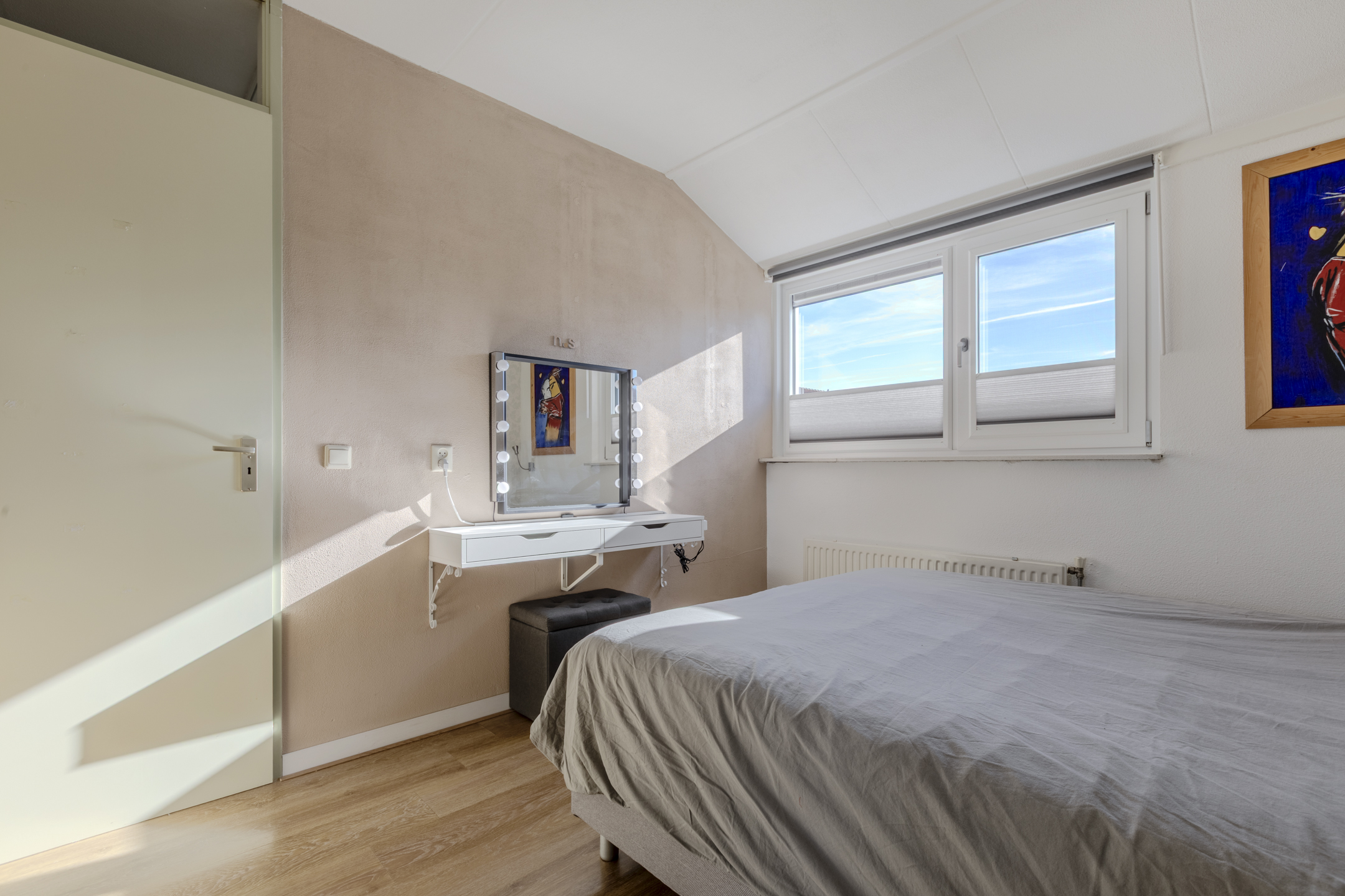 Prachtige zolderslaapkamer circa 14m² met een grote dakkapel (voorzien van een ingebouwd elektrisch bedienbaar rolluik), waardoor er een prettige en lichte slaapkamer is ontstaan. Deze slaapkamer is voorzien van een laminaatvloer, inbouwspots, vaste kasten met stijlvolle louvre deurtjes en bergruimte onder de dakschuinte.