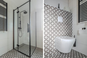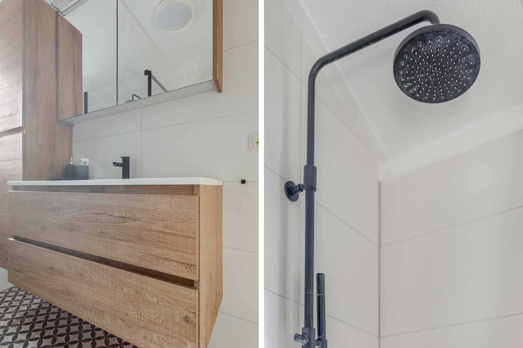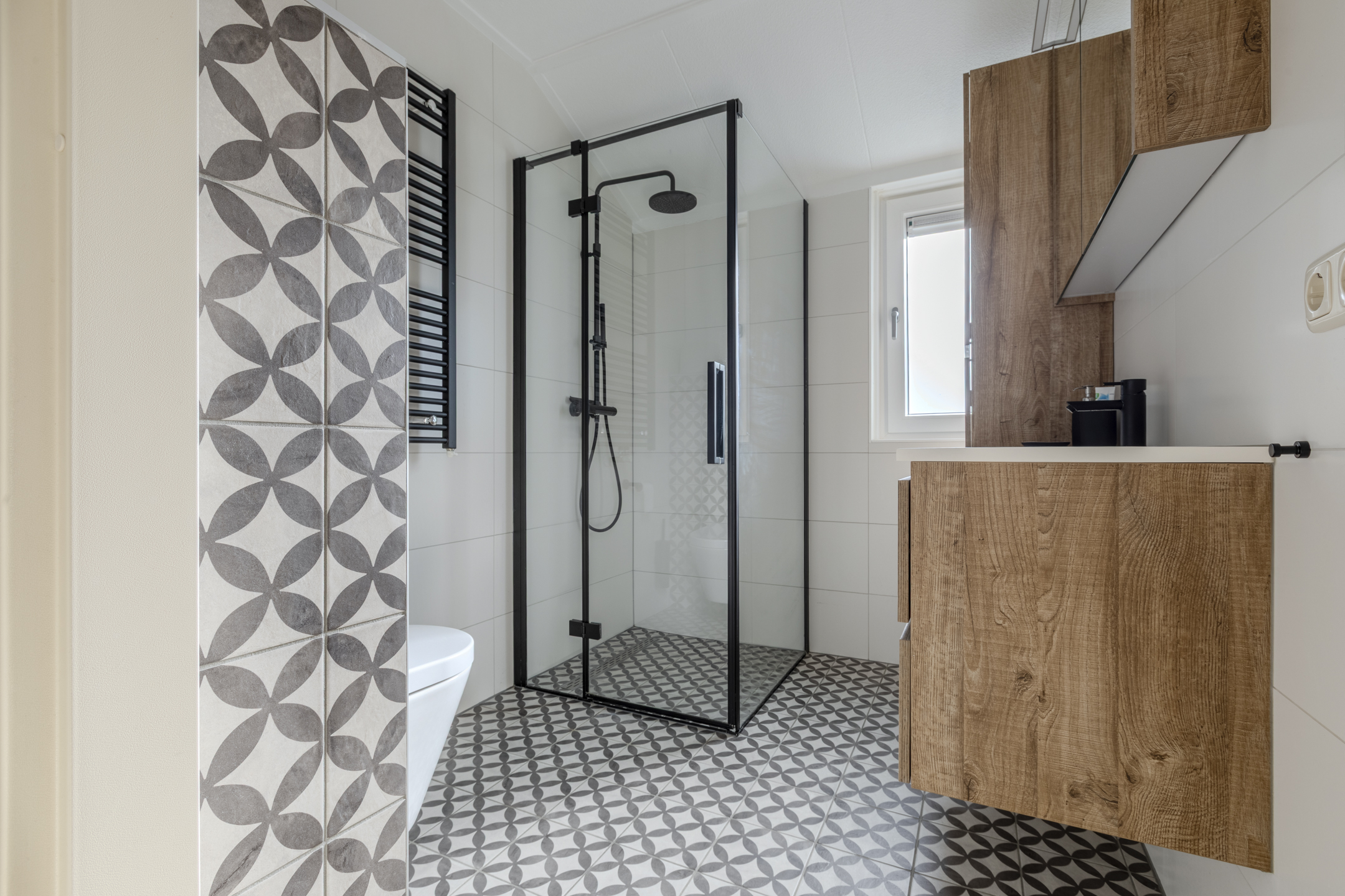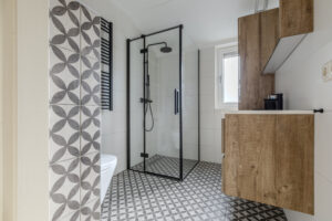 Moderne en luxe badkamer (2019) voorzien van een vaste wastafel met meubel, inloopdouche met regendouche en een thermostaat kraan, vrij hangend toilet en een design radiator.