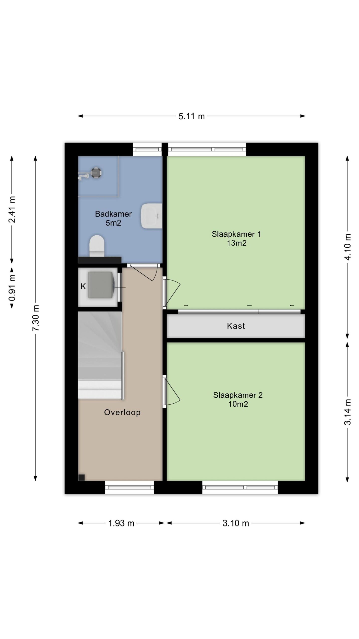 Voorslaapkamer circa 10m² en een achterslaapkamer circa 13m² met vaste kastenwand. Beide slaapkamers zijn voorzien van een laminaatvloer.