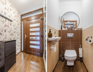 Entree, hal met tegelvloer, uitgebreide meterkast en een luxe toiletruimte voorzien van een vrij hangend toilet met fontein.