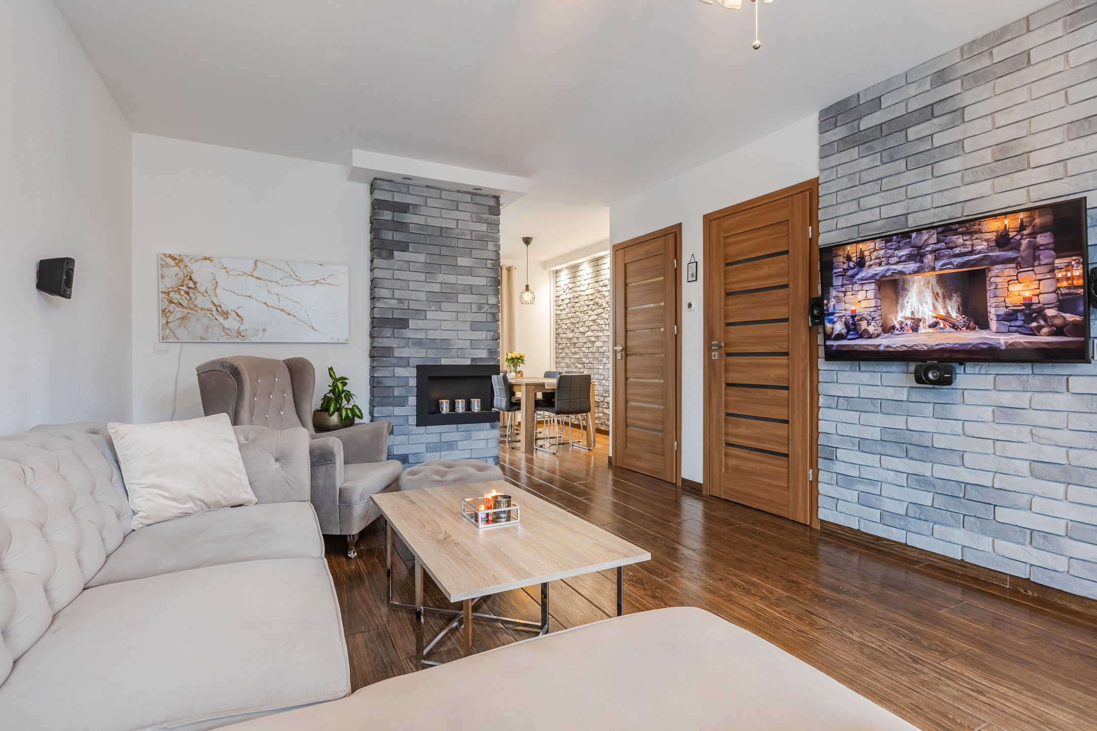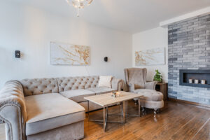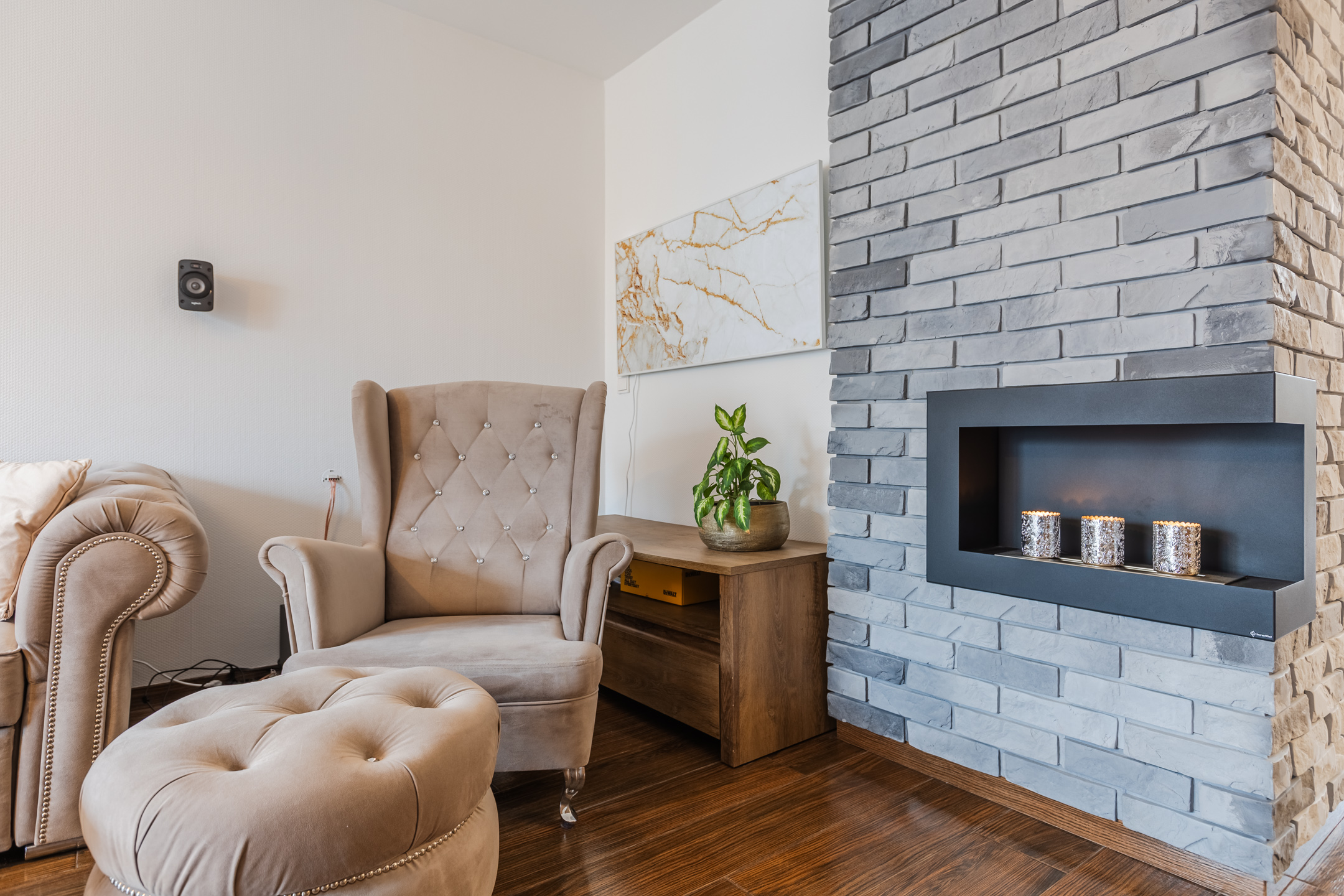 Sfeervolle en ruime woonkamer circa 35m² (inclusief keuken) met tegelvloer voorzien van vloerverwarming, sfeervolle bio ethanol haard en een praktische trapkast. Een schuifpui geeft toegang tot de achtertuin.