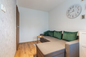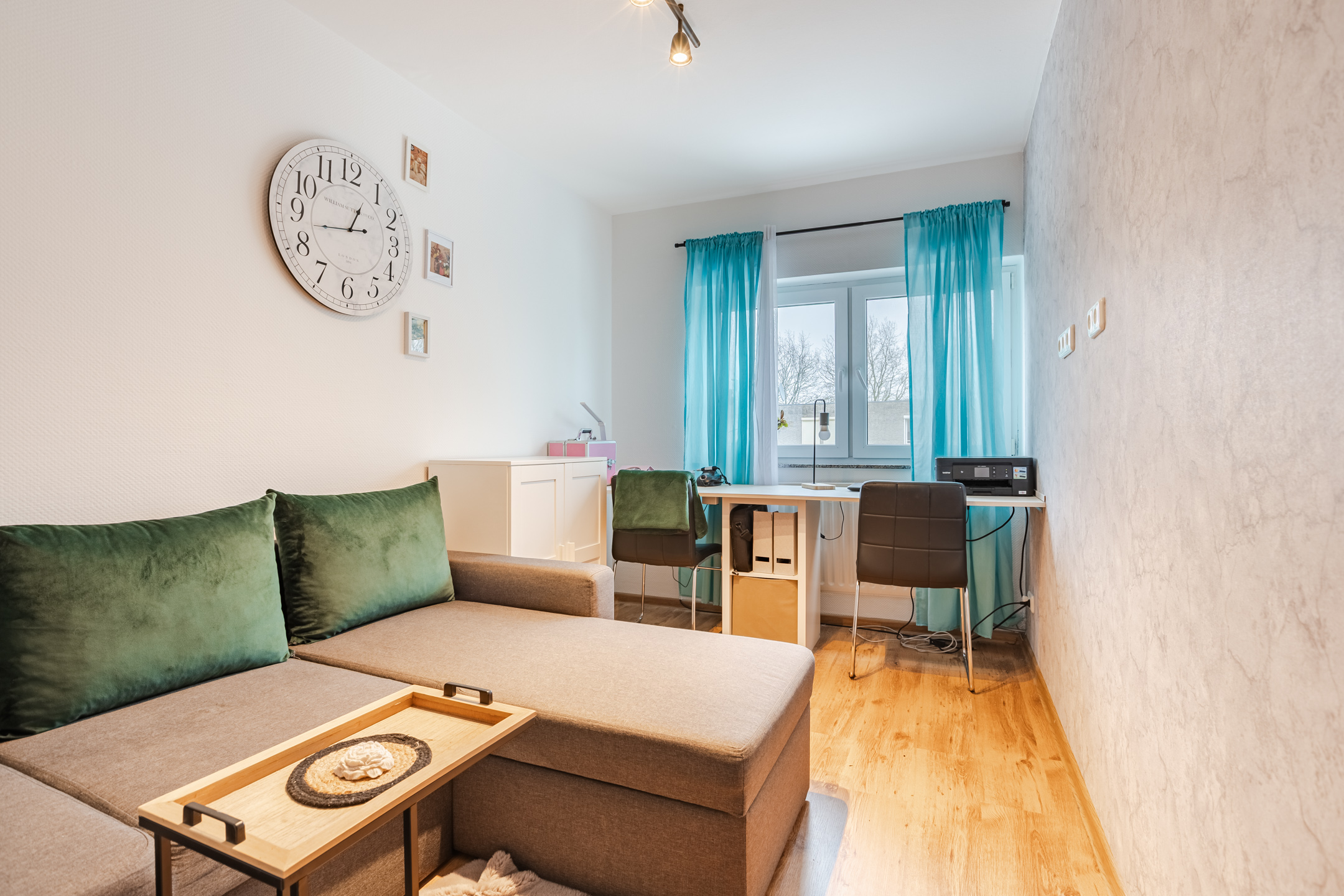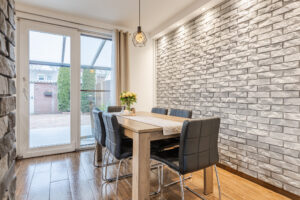 De ramen aan de voor- en achterzijde van de woonkamer lopen tot de vloer door, wat een fraai zicht geeft en voor extra lichtinval zorgt.
