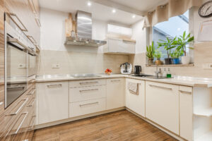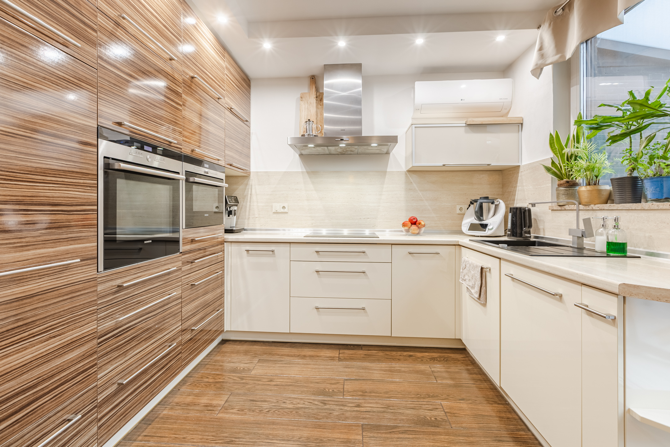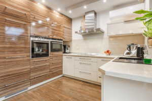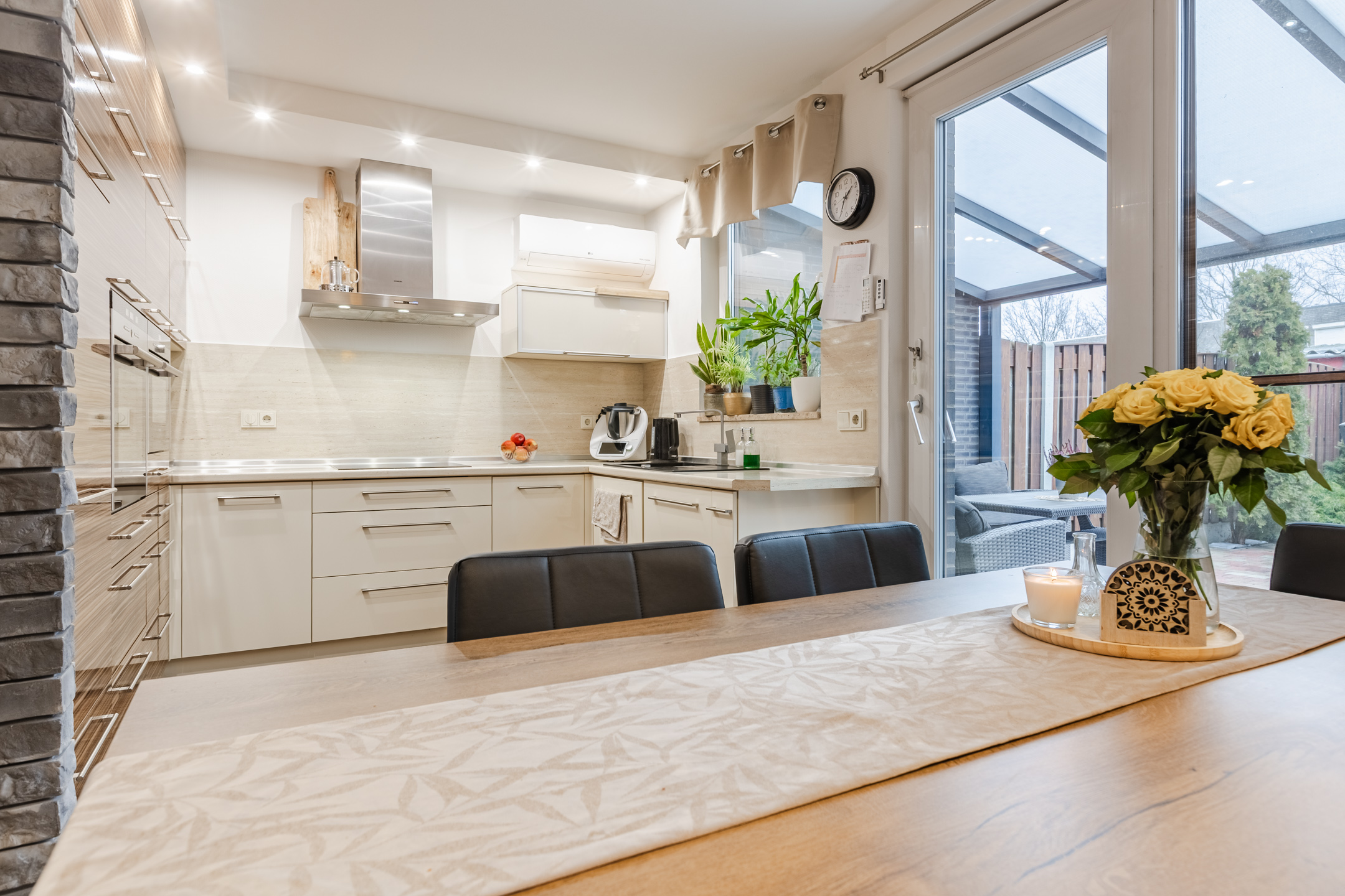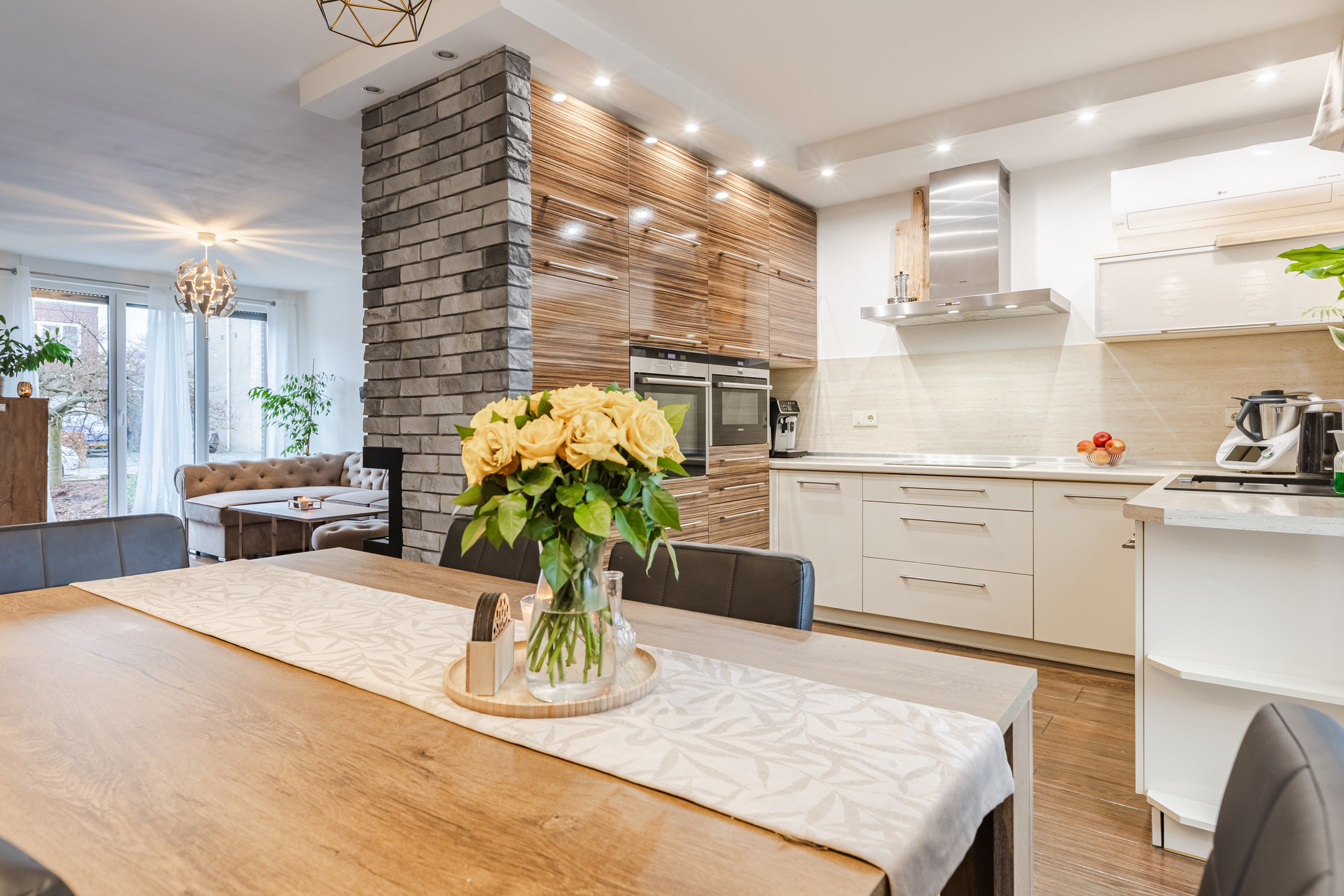 Aan de achterzijde van de woning is de semi open keuken gelegen met een moderne keukeninrichting in U-vorm. De keukeninrichting is voorzien van een inductie kookplaat, afzuigkap, koelkast met vriesvak, oven, combi magnetron en een vaatwasser.