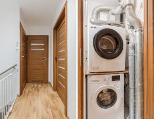 Vaste kast met de aansluitingen voor de wasapparatuur en de unit voor de mechanische ventilatie.