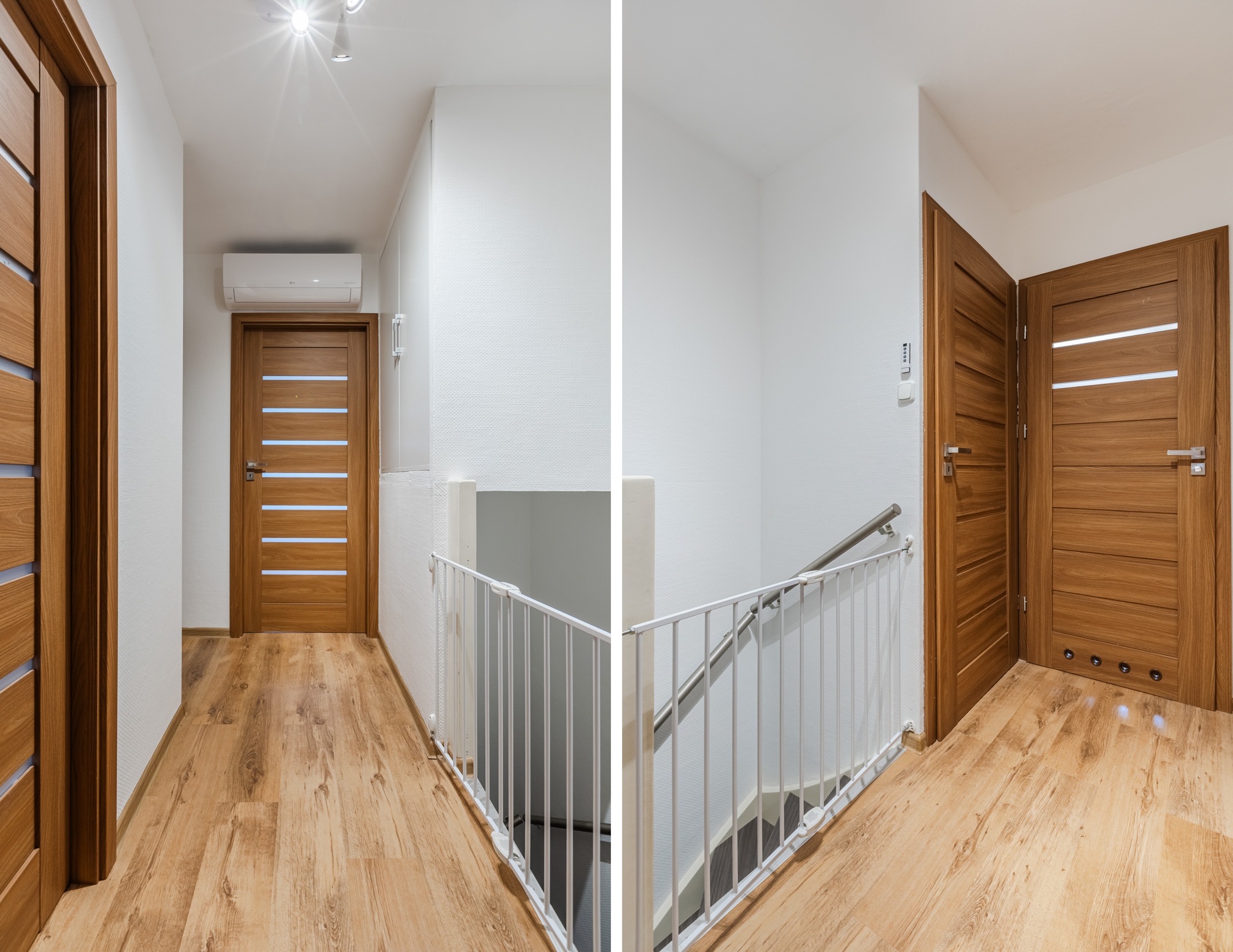 Overloop met laminaatvloer en een airco (2025). Boven de trapopgang is nog extra, praktische bergruimte gecreëerd.