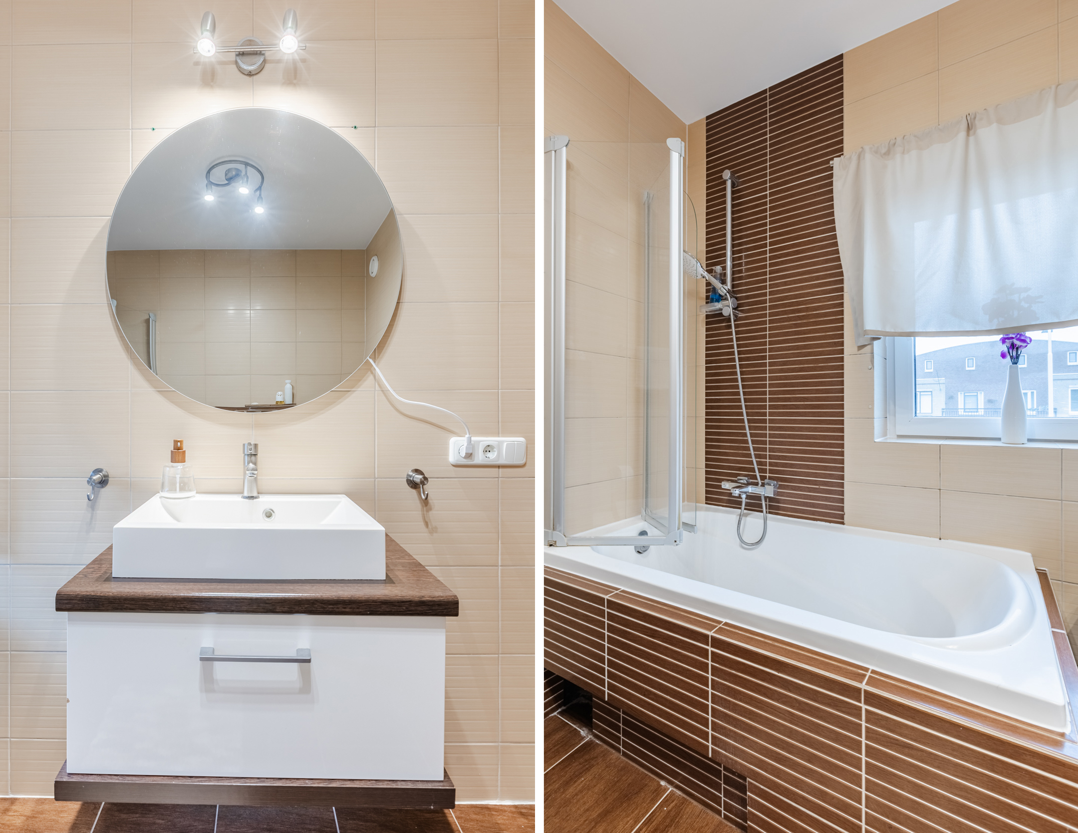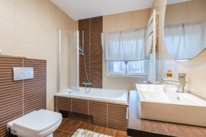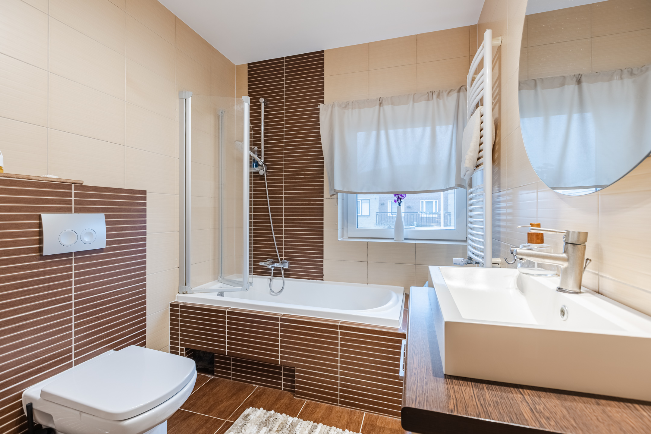 Luxe badkamer voorzien van een vaste wastafel met meubel, ligbad met thermostaat kraan en douchegelegenheid, vrij hangend toilet en een design radiator. De badkamer is daarnaast voorzien van strak stucwerk plafondafwerking.