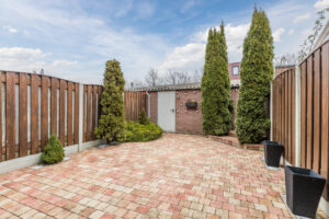 Ruime en bestrate voortuin met toegang tot de entree van de woning.