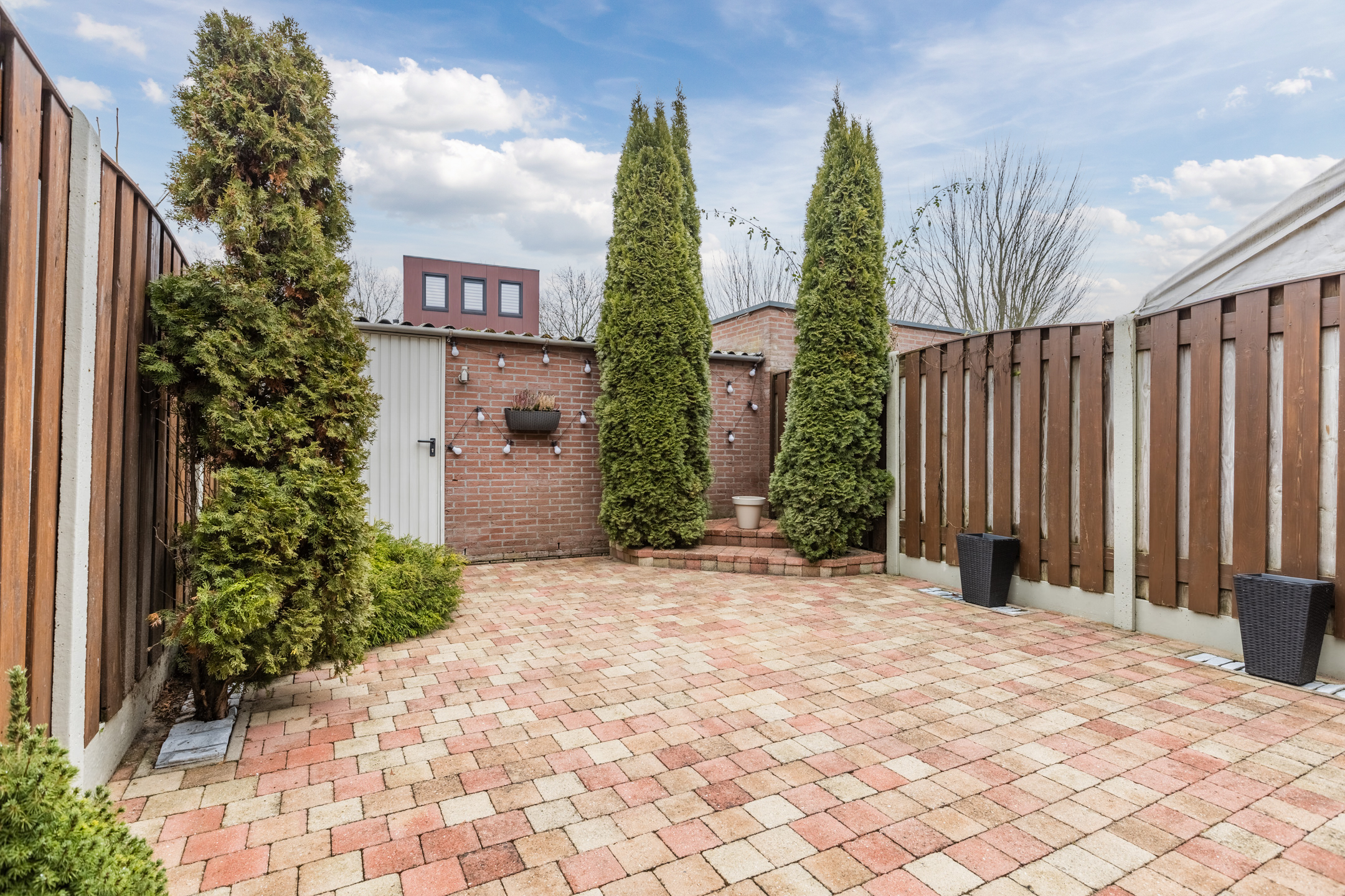 De ruime en onderhoudsvriendelijke achtertuin is op het oosten gelegen. De achtertuin is bestraat en voorzien van diverse borders.
