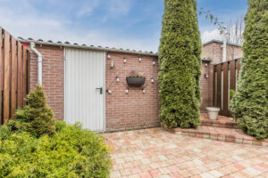 Achterin de tuin is een grote, over de volle breedte van het perceel gelegen stenen berging aanwezig met de achterom.