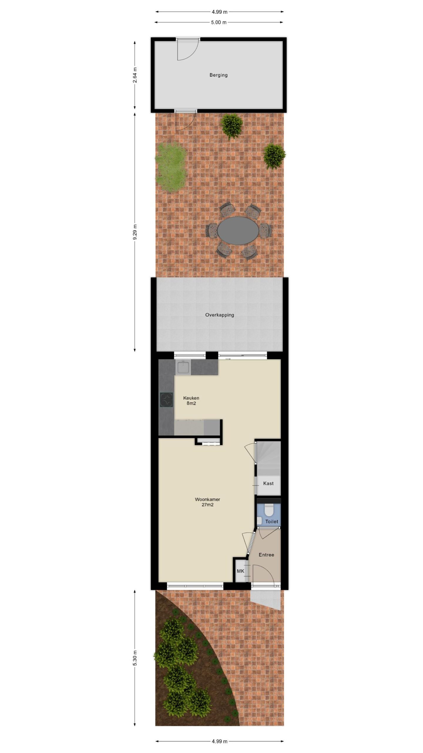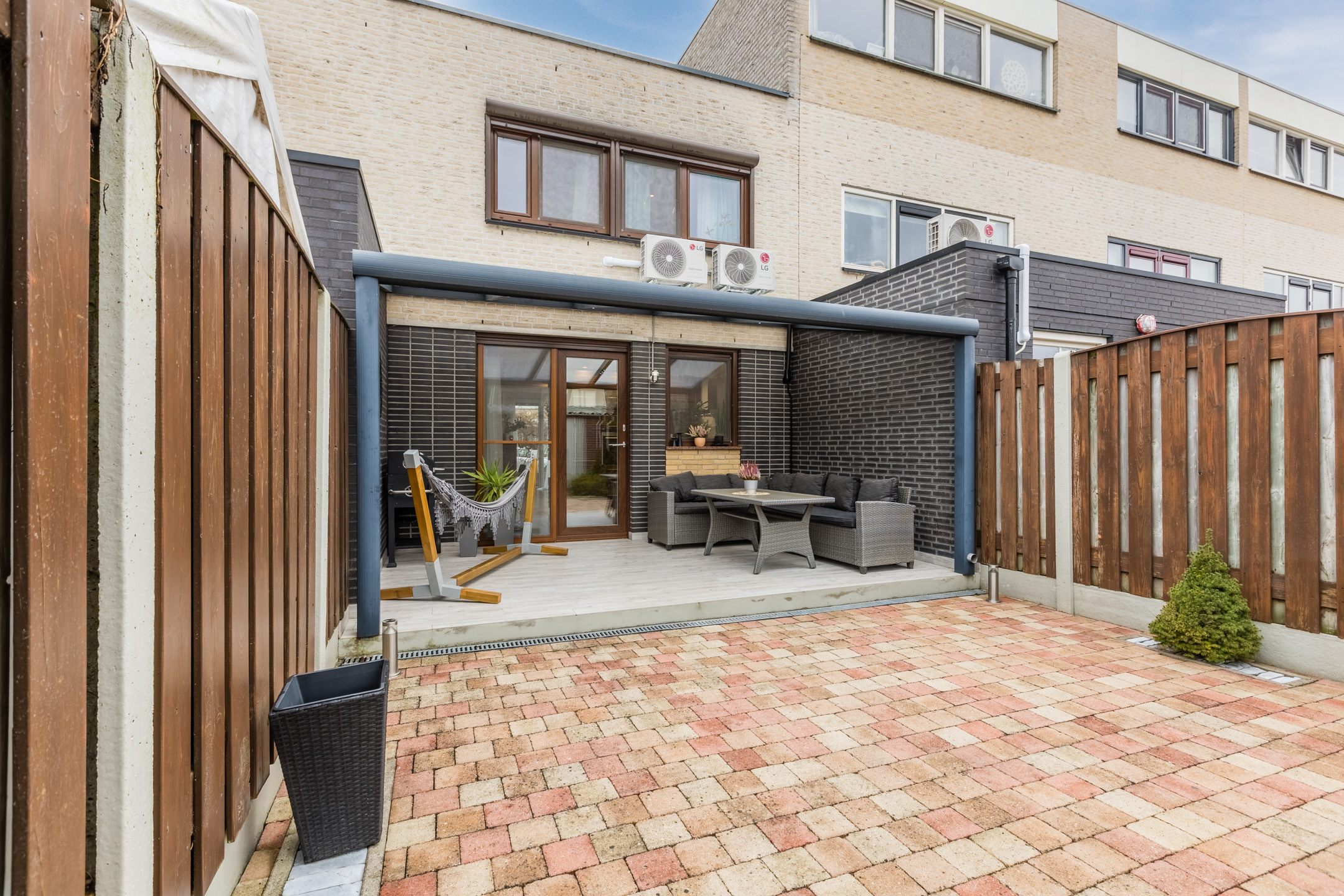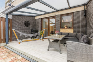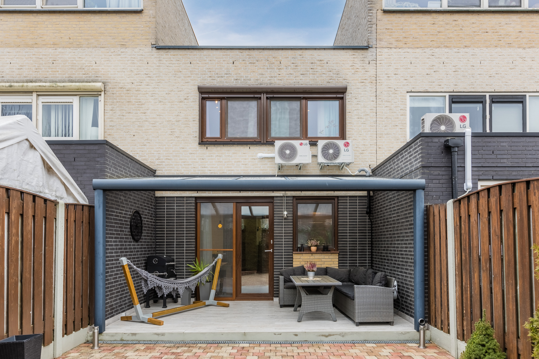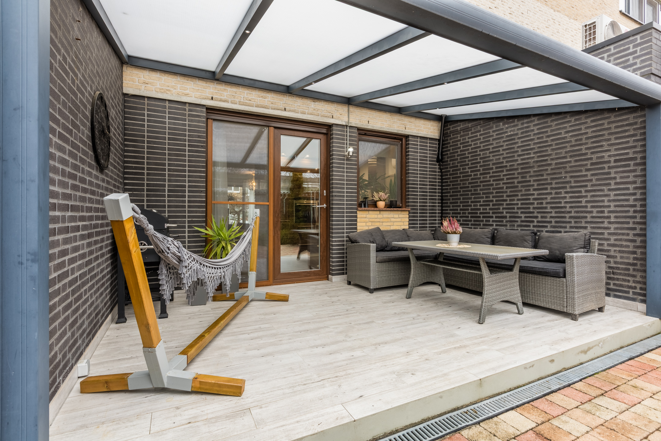 Direct achter de woning is een gezellige overkapping met inbouwspots aanwezig.