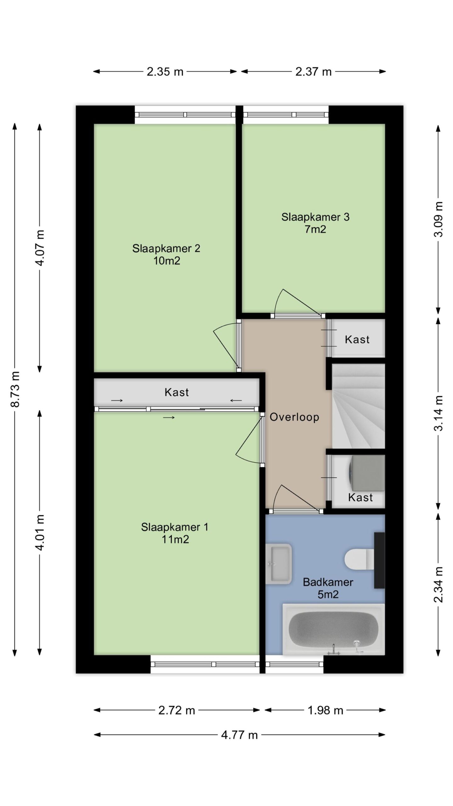 Voorslaapkamer circa 11m² met een vaste kastenwand en televisie aansluiting, achterslaapkamer circa 10m² en een achterslaapkamer circa 7m². Alle slaapkamers zijn voorzien van een laminaatvloer.