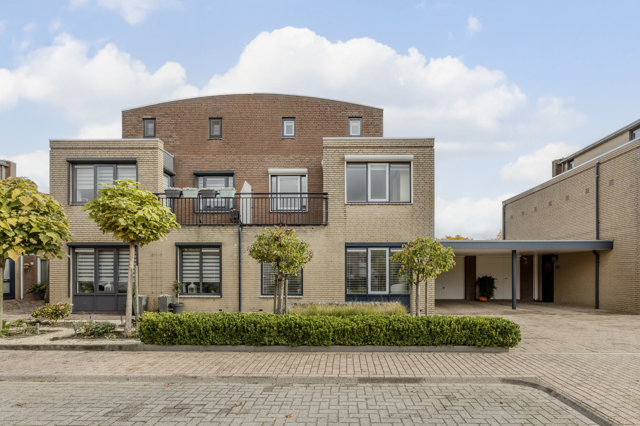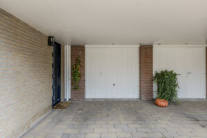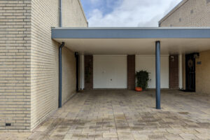 Onderhoudsvriendelijke voortuin. De diepe oprit met carport geeft toegang tot de entree van de woning en de garage.